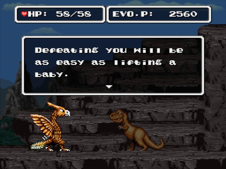 Finally beat EVO. I turned into a gigantic bird and, after listening to what the Tyrasaurus had to say, chose the non-violent path, which I believe is the gameās Good Ending