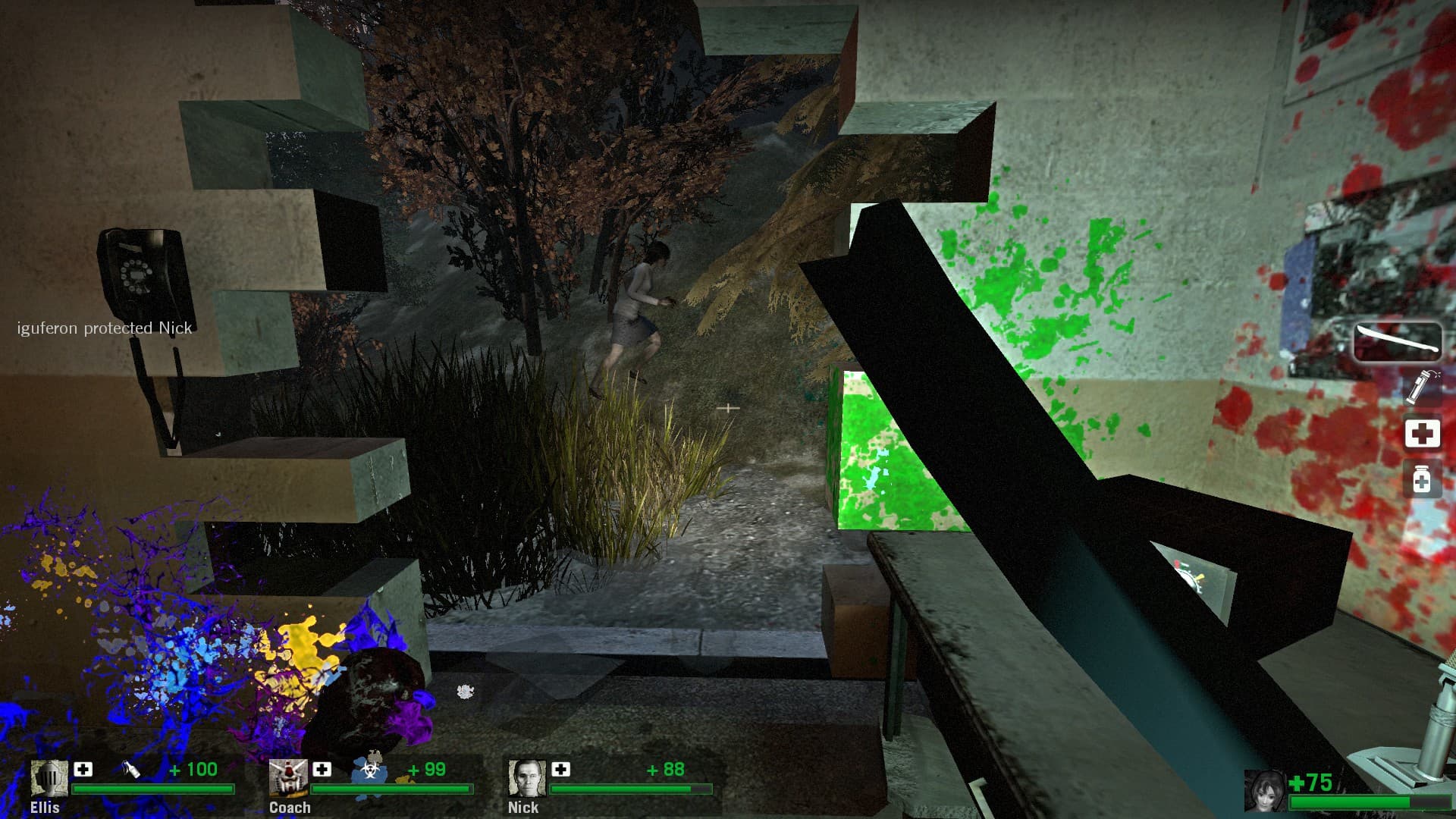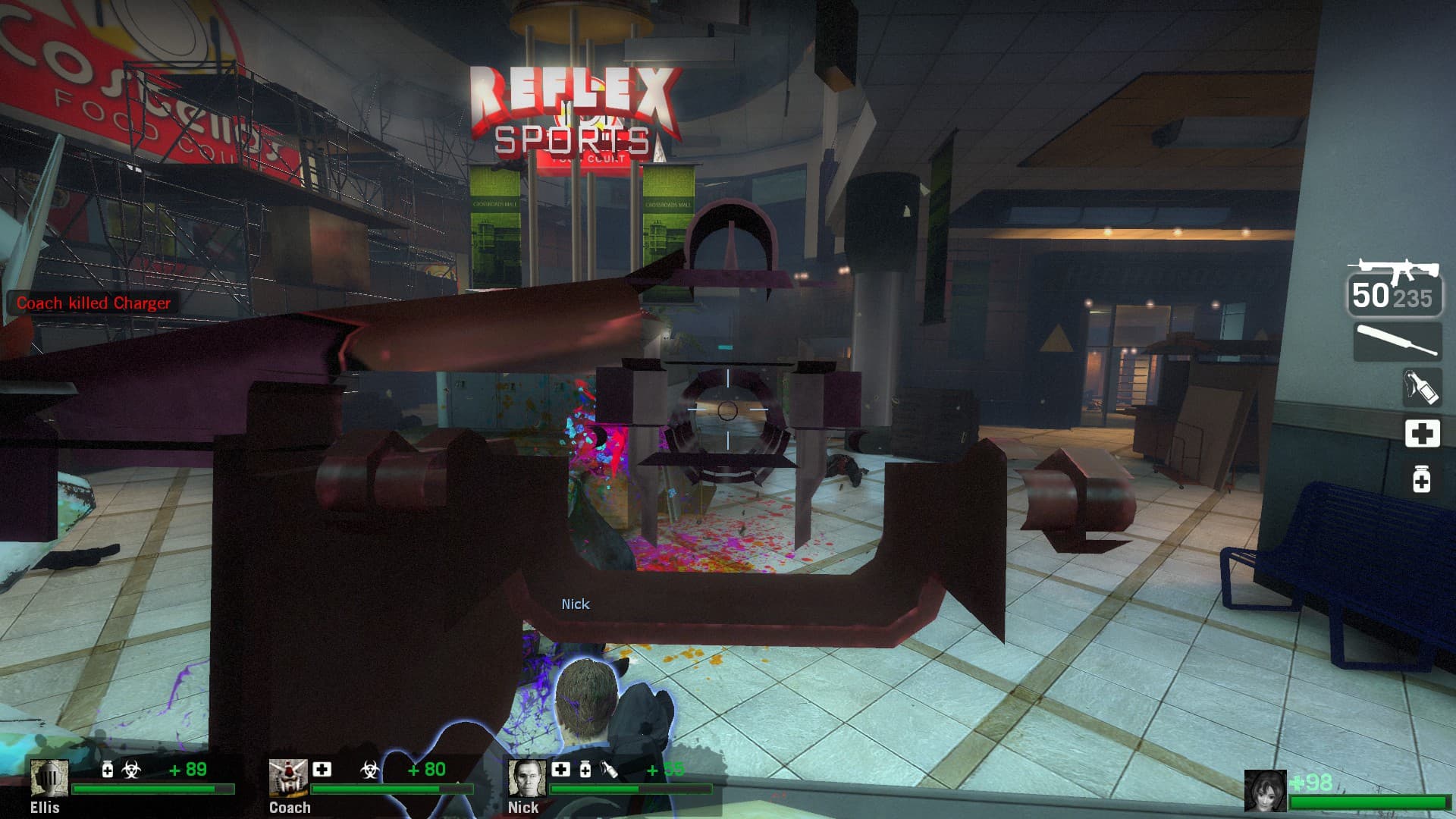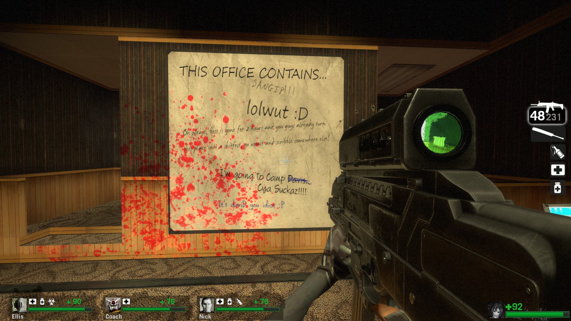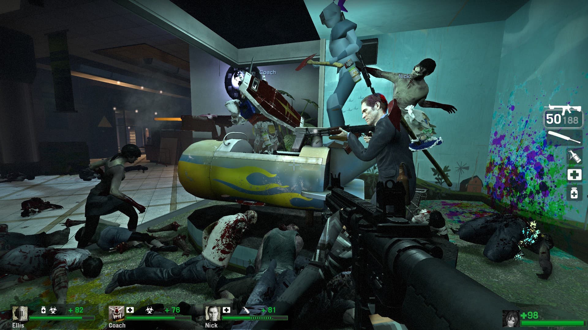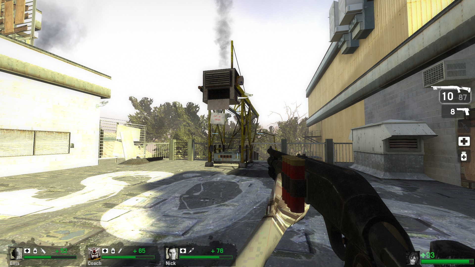 ok so this post is insanely long and im wrapping it up here, because it takes fucking 90 minutes to trudge your way around zacks mall and it took 90 minutes to write this and its gonna take 90 minutes to read this. finally the dickhead guard tells you theres going to be a helicopter on the roof and you need to get there. its whats called a gauntlet event where you basically just have to keep battling while nonstop hordes attack you. this is where the lack of items really fucks you over, and i dont understand why the designers had no problem giving you tier 2 weapons on map 1 eliminating any sense of progression with weaponry but couldnt give me some fucking medkits when i have to fight through a chunk of mall and all the way up a parking structure to get to the “helicopter.” you get up to this rooftop which has a fortified central structure in the middle, then pretty shortly the security guard busts through a door in the fortified bus from the movie and it actually caught me off guard because he immediately plowed into one of the AI bots and killed him outright. you basically have to know he’s going to drive 360 and then park directly in the middle of the previously inaccessible fort otherwise you just straight up die after all that struggle. apparently this is the new finale, there is some old version of it that got replaced before they ported it to l4d2 that theoretically explains why there is a helicopter mentioned. im sure this all is only mildly interesting at best. i dont really hate this mod anymore, its just kinda extremely mid with all the changes. it never made it into no more room in hell (which has been on steam for 11 years now!) in any form. no wonder its fallen into semi-obscurity as a small piece of source modding history