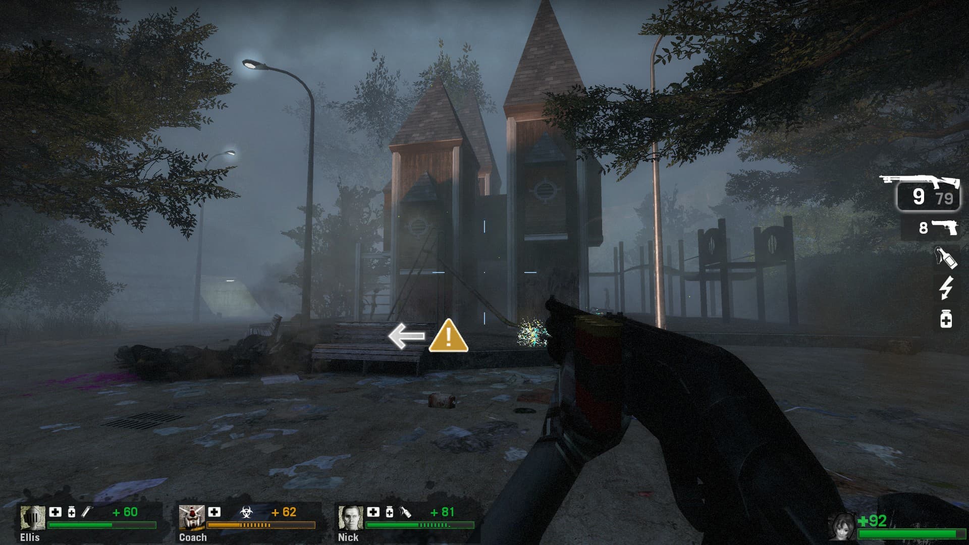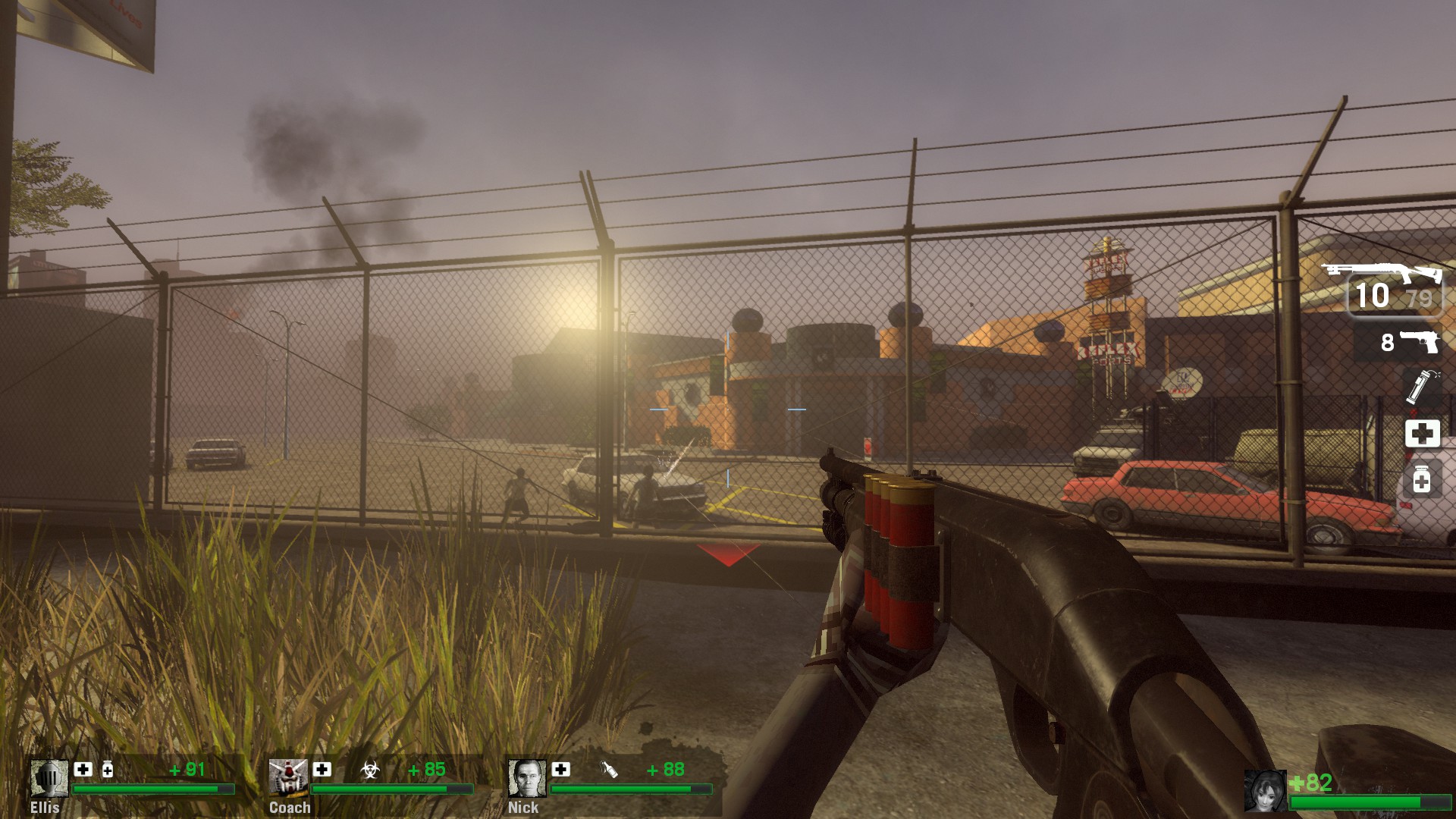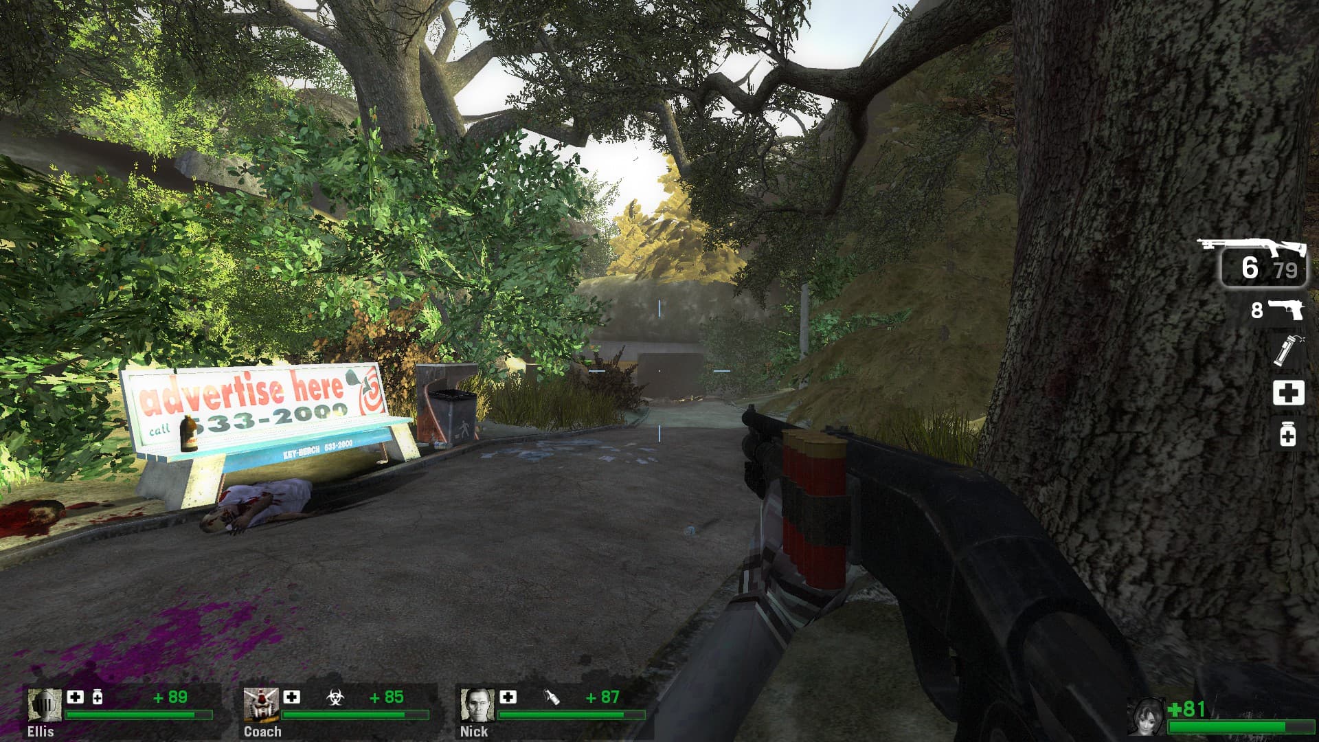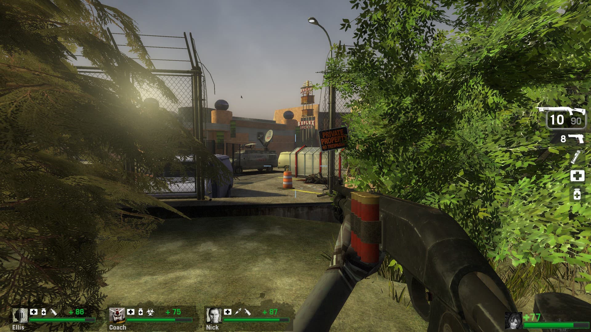 the exterior of THE MALL is actually pretty well designed for a L4D map, theres multiple paths into the parking lot and even if you miss the short way (pictured, because i missed it) its pretty hard to miss the long way around. out here and the surrounding park are some of the few pieces of level geometry that remind me of the movie at all