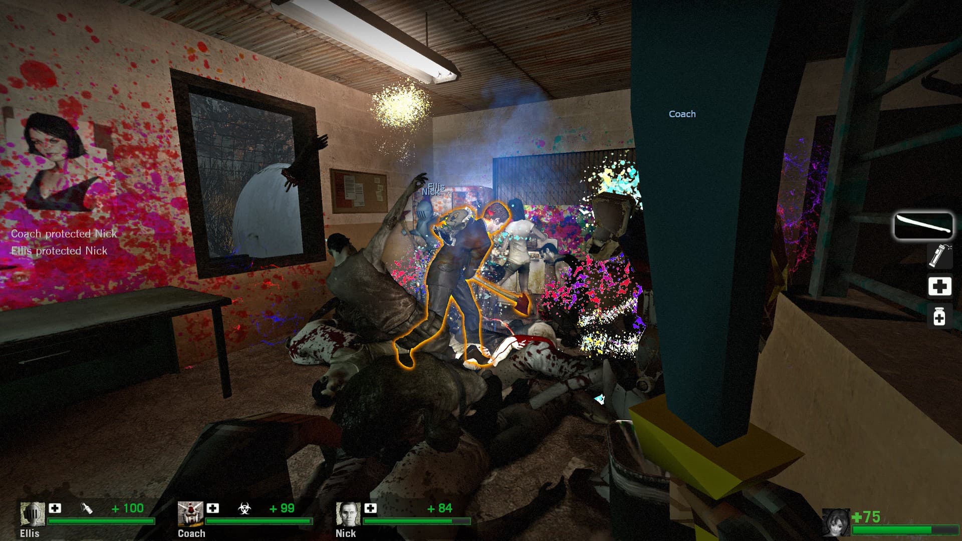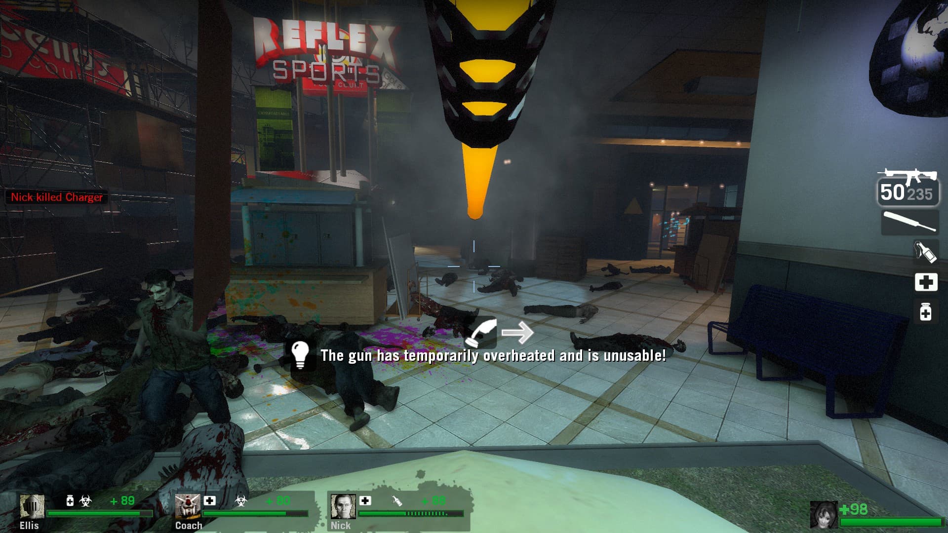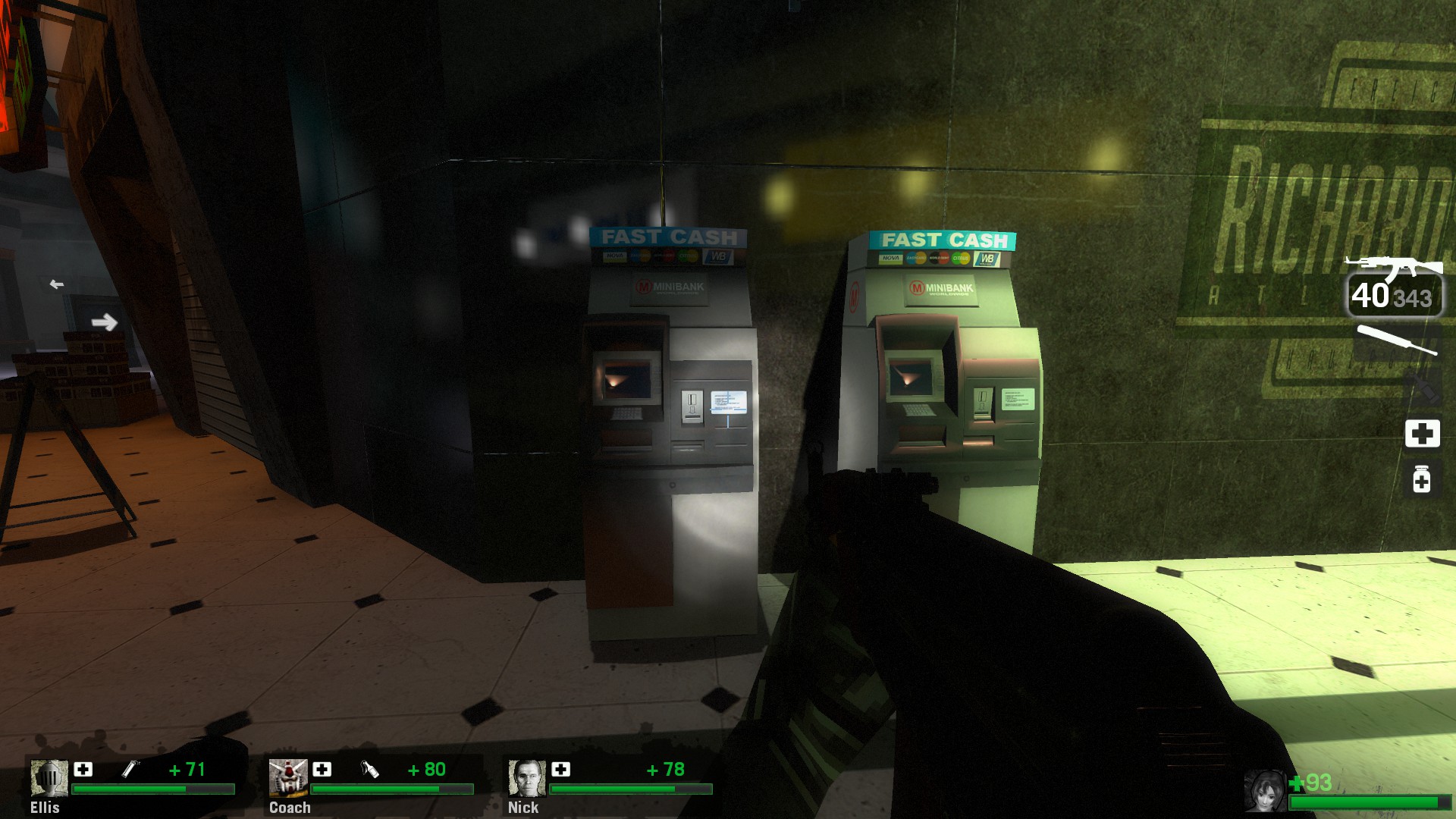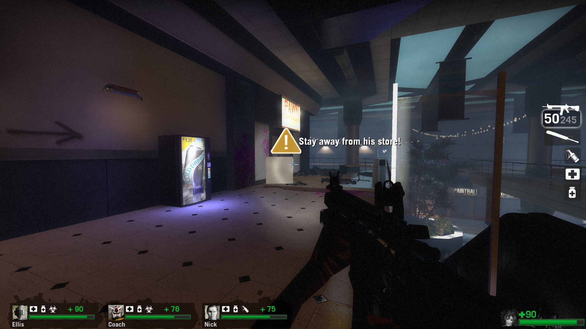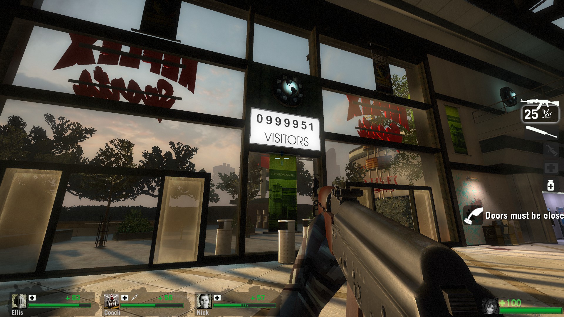 this is where i remember quitting for a LONG time when this came out. your informed by the annoying guard that if more than 50 people cross through the front doors a big celebration is gonna happen and everyone dies. in the original version of the mod failing this meant you lost the whole campaign. in the majority of the versions since, this mechanic was replaced by teleporting everyone to “the nightmare room” where you’re forced to begin again and repeat the section until you can keep the zombies out. up until this point you have to make it through multiple panic events and a good chunk of mall with a few throwables and no medkits. i guess somewhere along the line someone realized this rightfully sucks and now if you fail a tank spawns and then the bank doors that normally open when you complete the event just explode open. you can trigger this by running back and forth through the doors before any zombies spawn and its much faster lol. this idea clearly meant a lot to someone so it’s funny that you can just completely opt out now. i would have cut this setpiece entirely so i don’t know if any of these solutions to the problem are particularly good or elegant