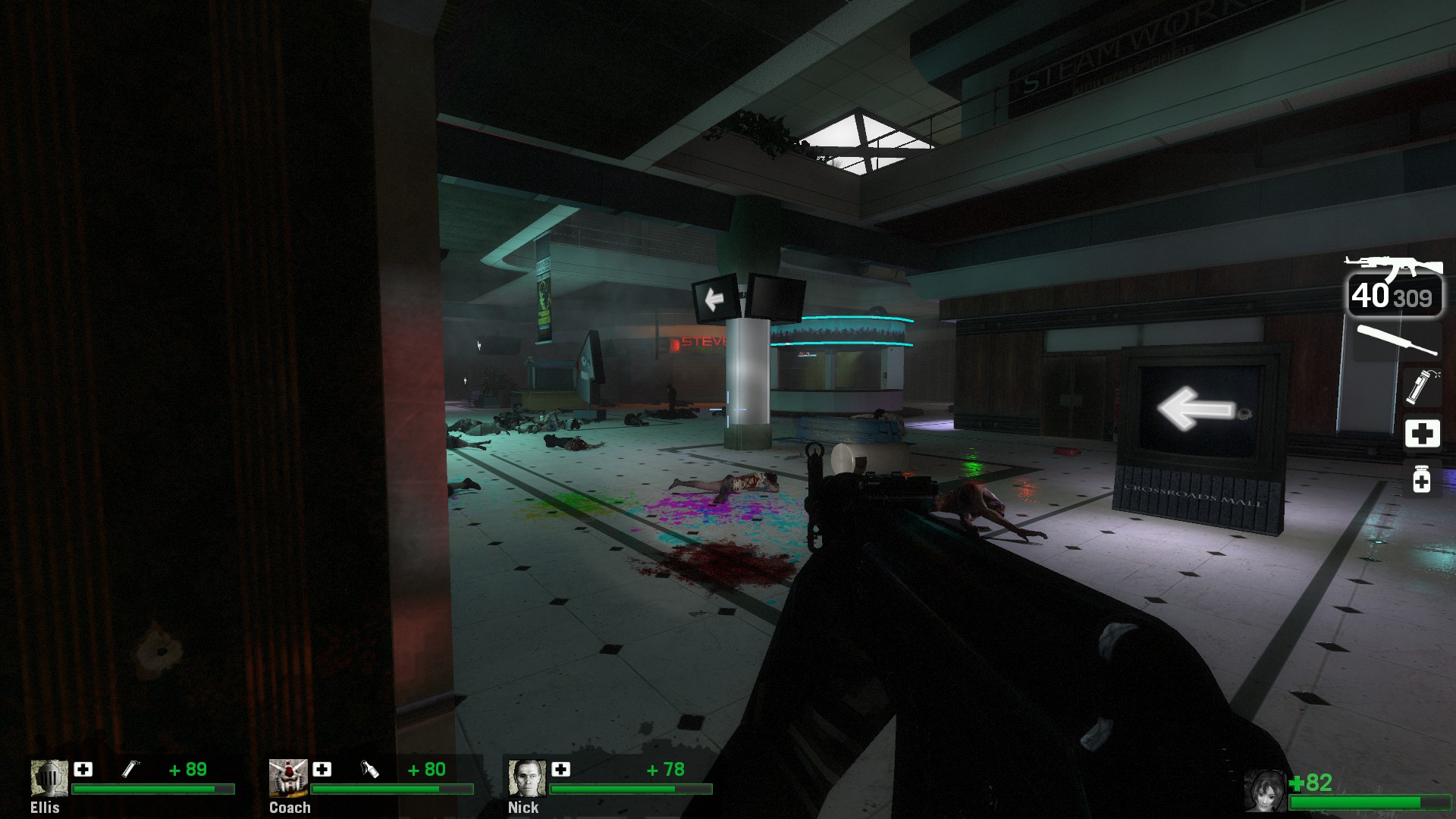 you never really get a good sense of the layout of the mall or where your ultimate destination is, which is something the valve campaigns do really well. the mall is a bizarre, sprawling labryinth, full of those shitty S shaped box warehouse rooms i hate in videogames and a whole filler level that feels like a procedurally generated SWAT 4 level made entirely of those grimy 70s carpeted offices you shoot russian mafia guys in