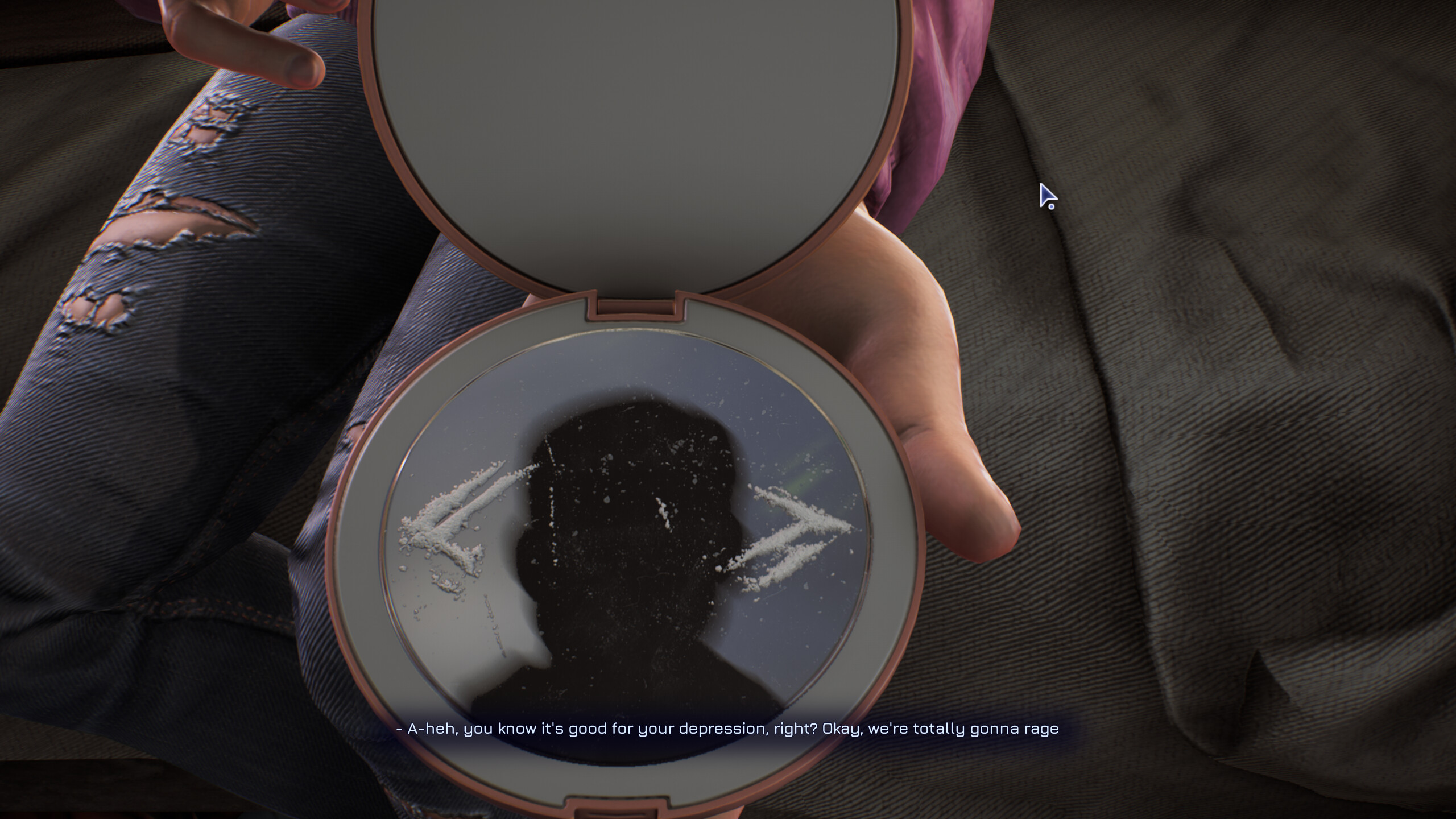 I accidentally skipped the intro to the retro FPS section cuz my finger brushed the fuckin’ HOME key or some shit? Then there was a scene where the player’s sister offers them cocaine and I think that was supposed to be character creation, I think you’re supposed to click on those arrows? But I didn’t realize that, I just clicked and it chose a face and I didn’t even get to do cocaine.