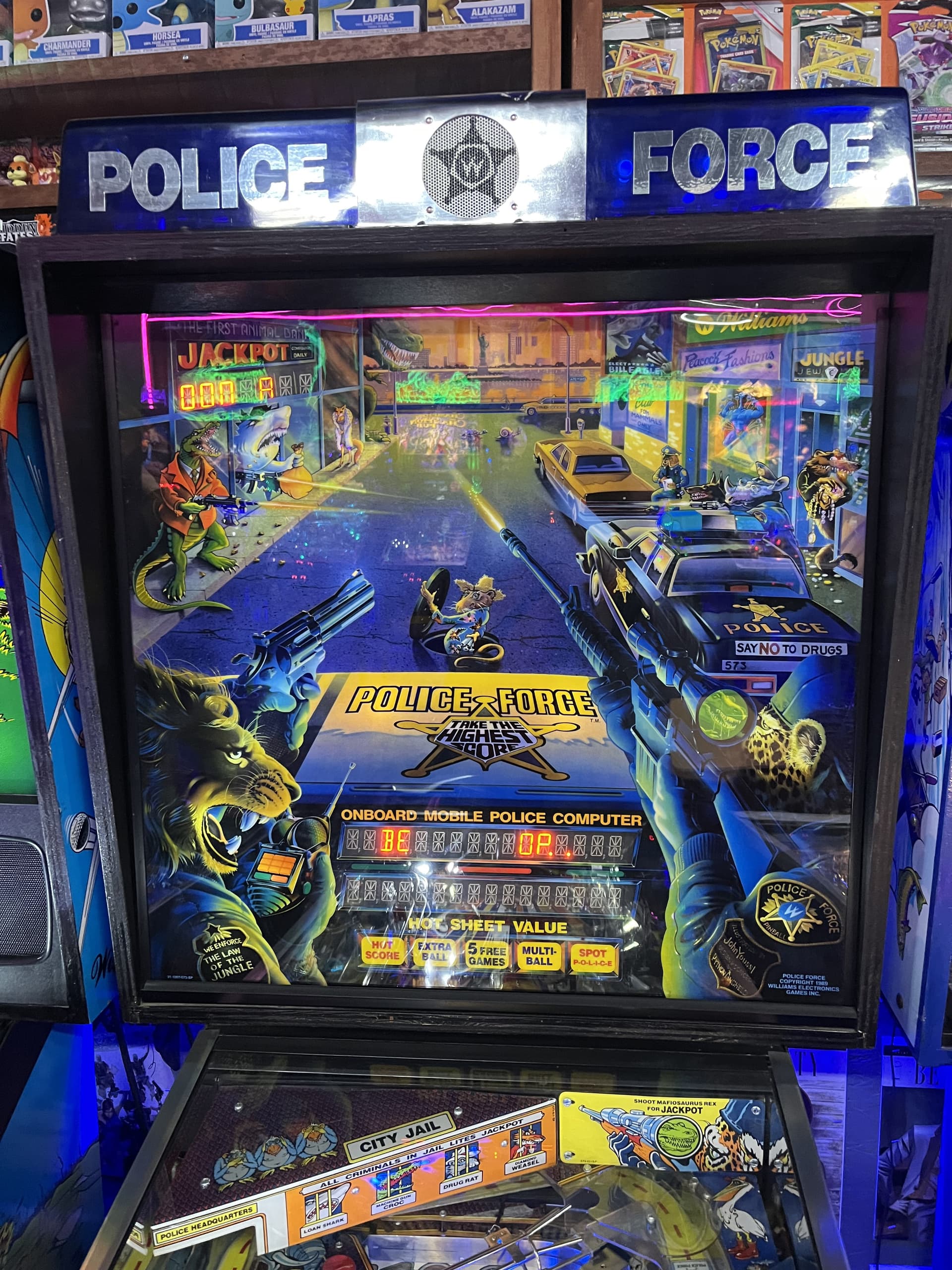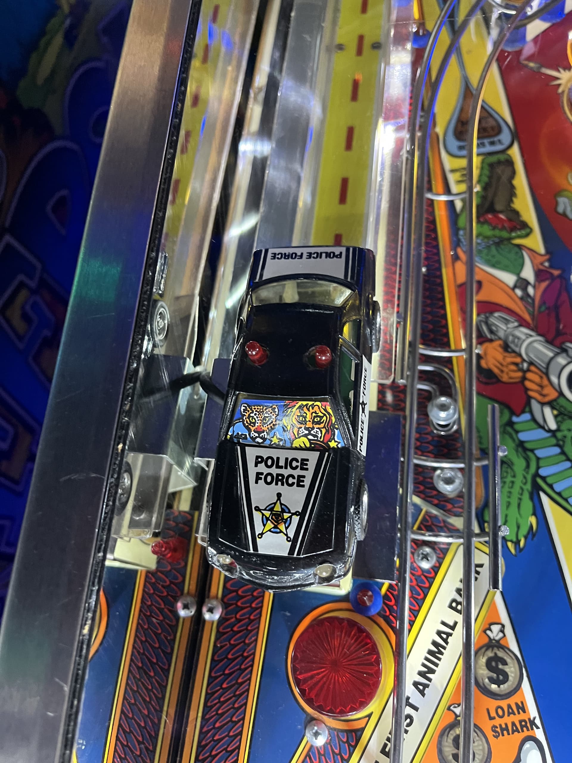The theming on this one confuses the hell out of me. It’s…cops with hyper detailed swat weaponry. But is also furries. It’s like someone got all the way into making this thing and realized that making a cop based pinball game with a fucking sniper rife bonus was a bad look but was so married to it they were like “Woah, if it’s furries it’s all good”. Alternatively, Zootopia ripped this machine off. The cool little plastic car that advances as you hit targets is nifty though.