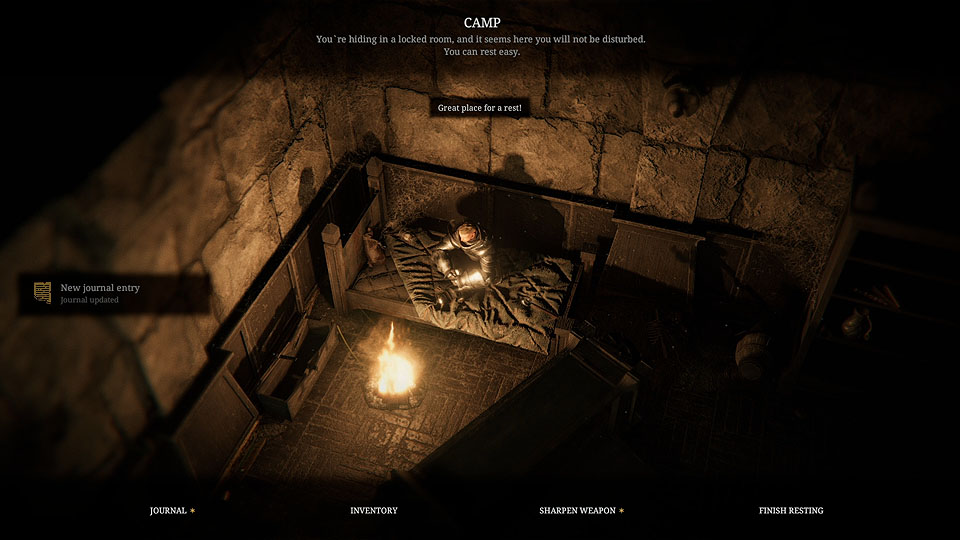Can rest on a bed, but has to be behind a closed door or else nightmares will prevent healing wounds, updating your journal (‘p’), reading found books, etc.
