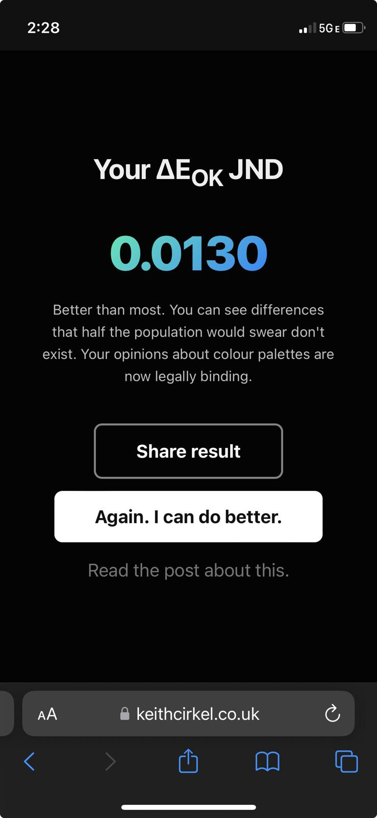 It wouldn’t let me scroll the page up on the results screen for some reason. I expected to do MUCH much worse considering I’m massively colorblind