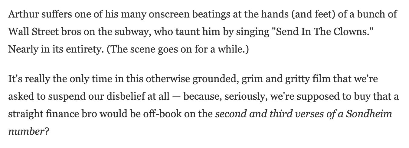 the thing that stands out nmost to me, and i havenât seen anyone else mention is that it doesnât look even a tiny bit like a movie about the joker. itâs just some generic crime movie but one guyâs in clown makeup