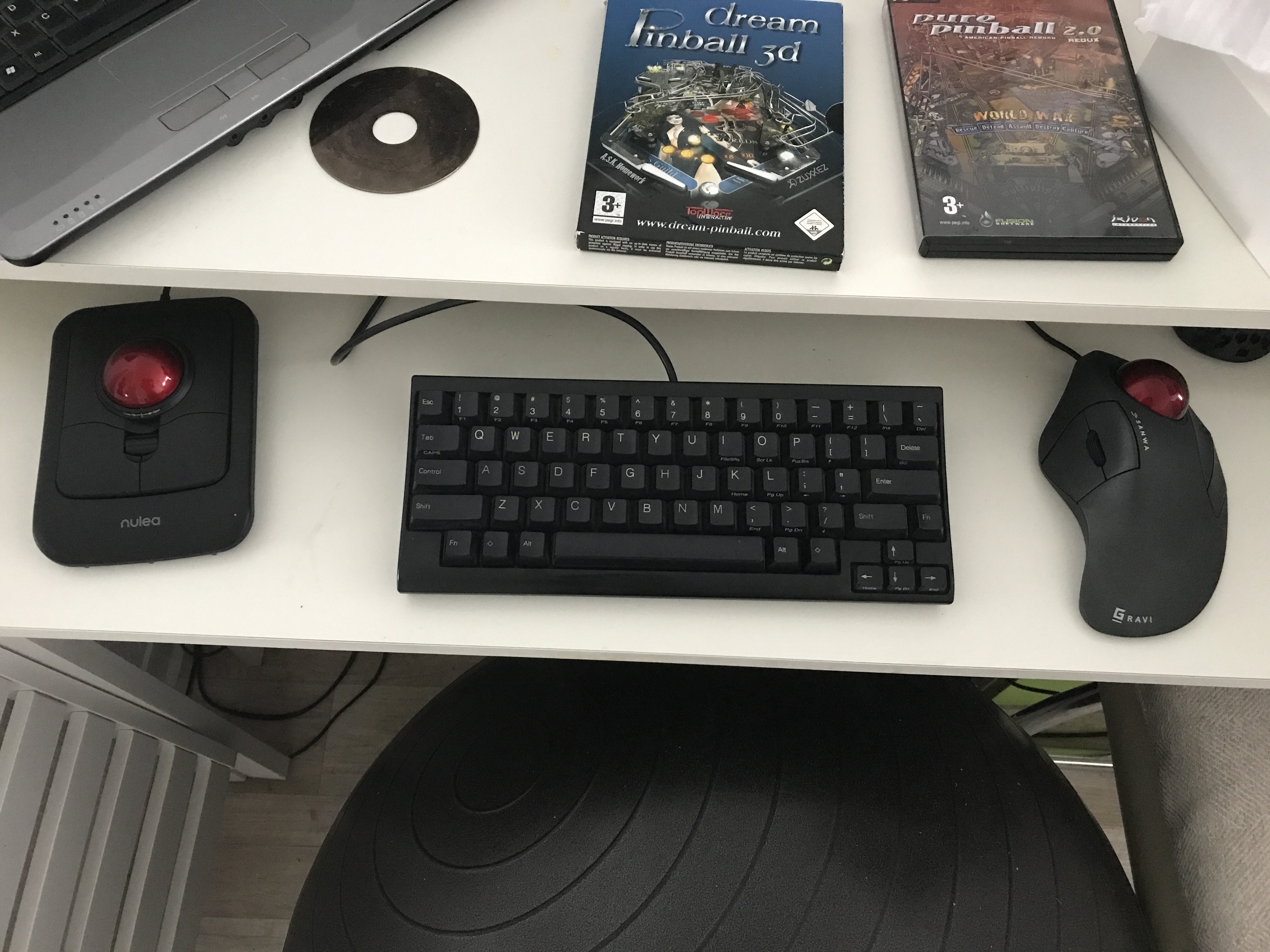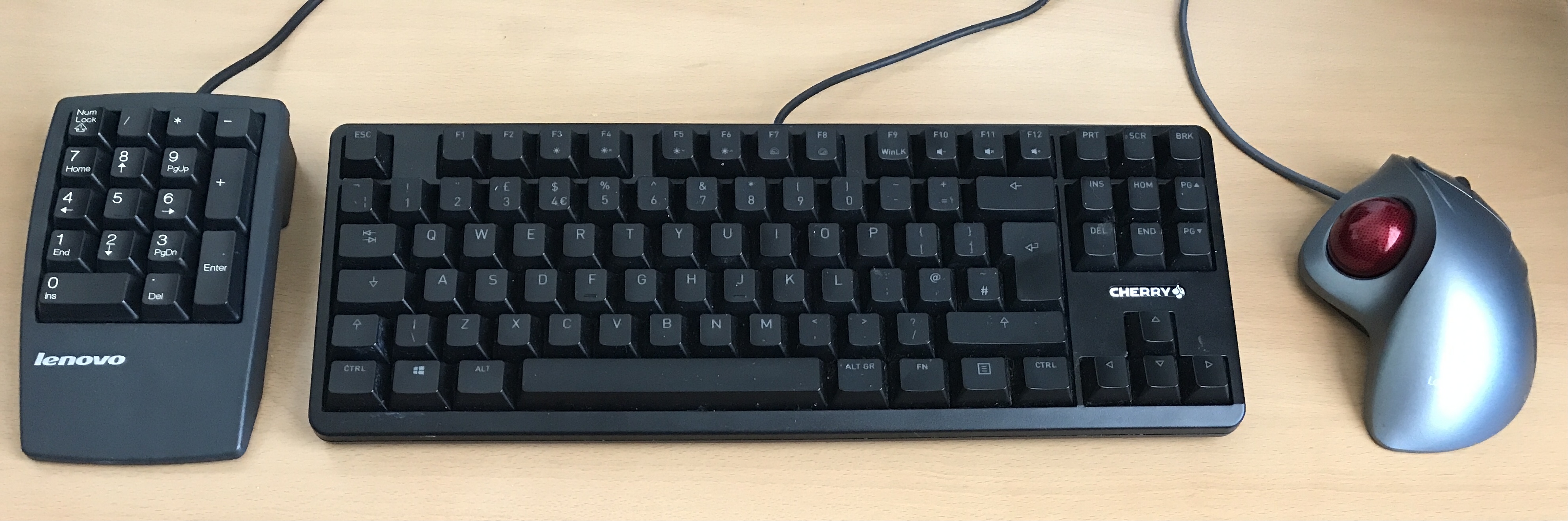 Ambidextrous trackball on the left is really nice when my right hand gets tired. Got MarbleScroll.exe in my autostart to turn the ball into a scrollwheel when 3rd or 4th button is held down.