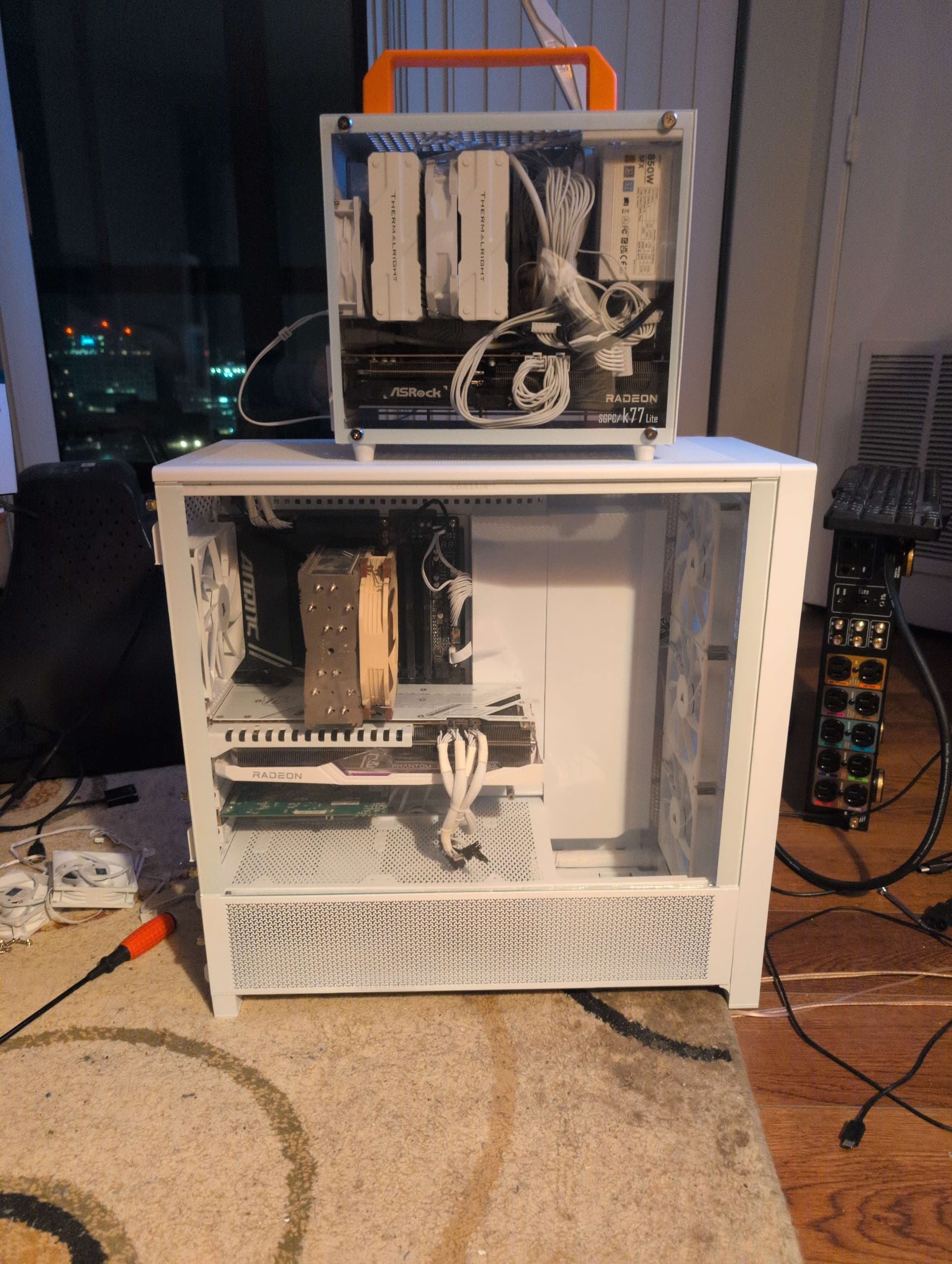 also I had to take out the fans out of the bottom because the clearance between them and the GPU was such that actually there was no clearance and on first boot I got an awful rattling sound made from the GPU fans spinning against the back of the case fans. but realistically, if there’s a GPU taking up most or all of the length of the case, those fans are just shoving air into it anyway and the CPU has it’s own flow (case fan is intake, cooler fan is pushing towards the PSU and I’m letting the PSU exhaust)