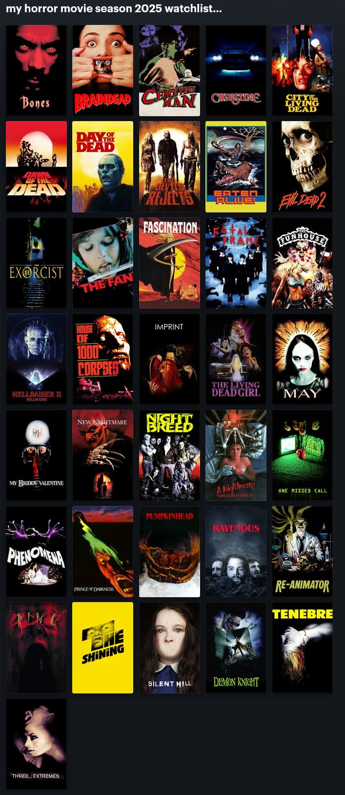expanding my horror movie watchlist… it was all stuff i havent seen, since making it the only one i have watched is the miike takashi film “one missed call” (very good!)
