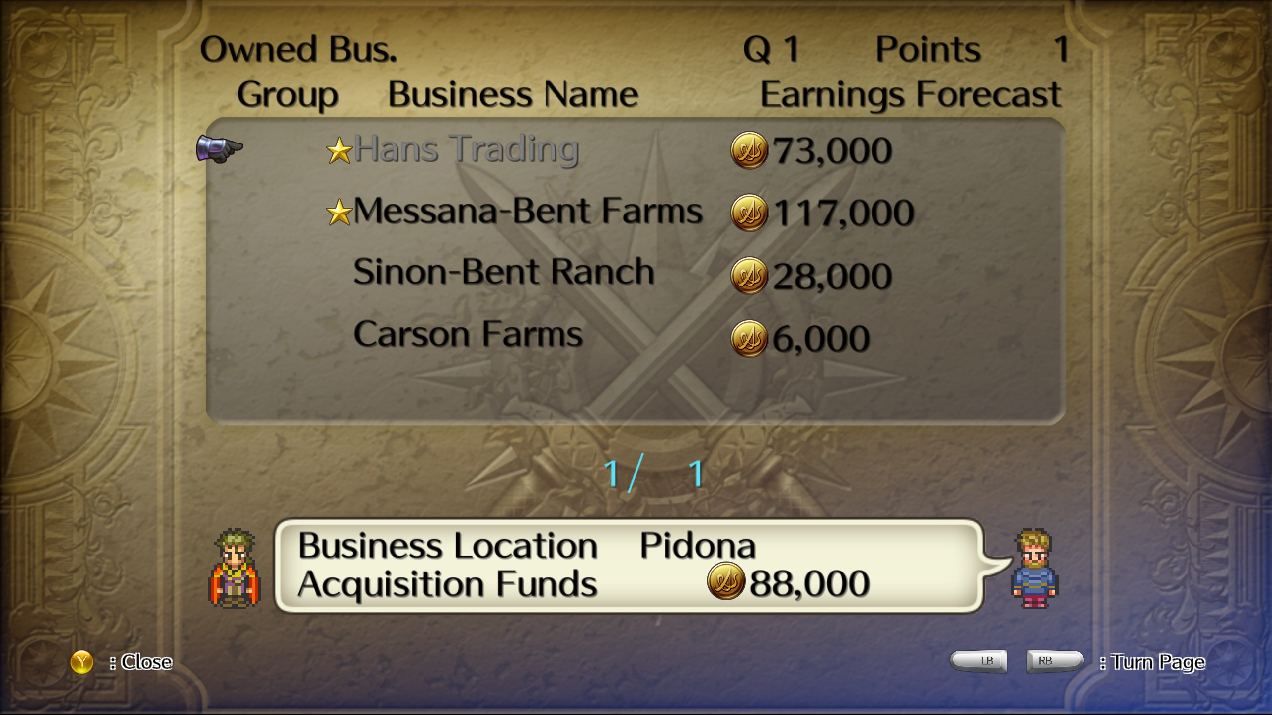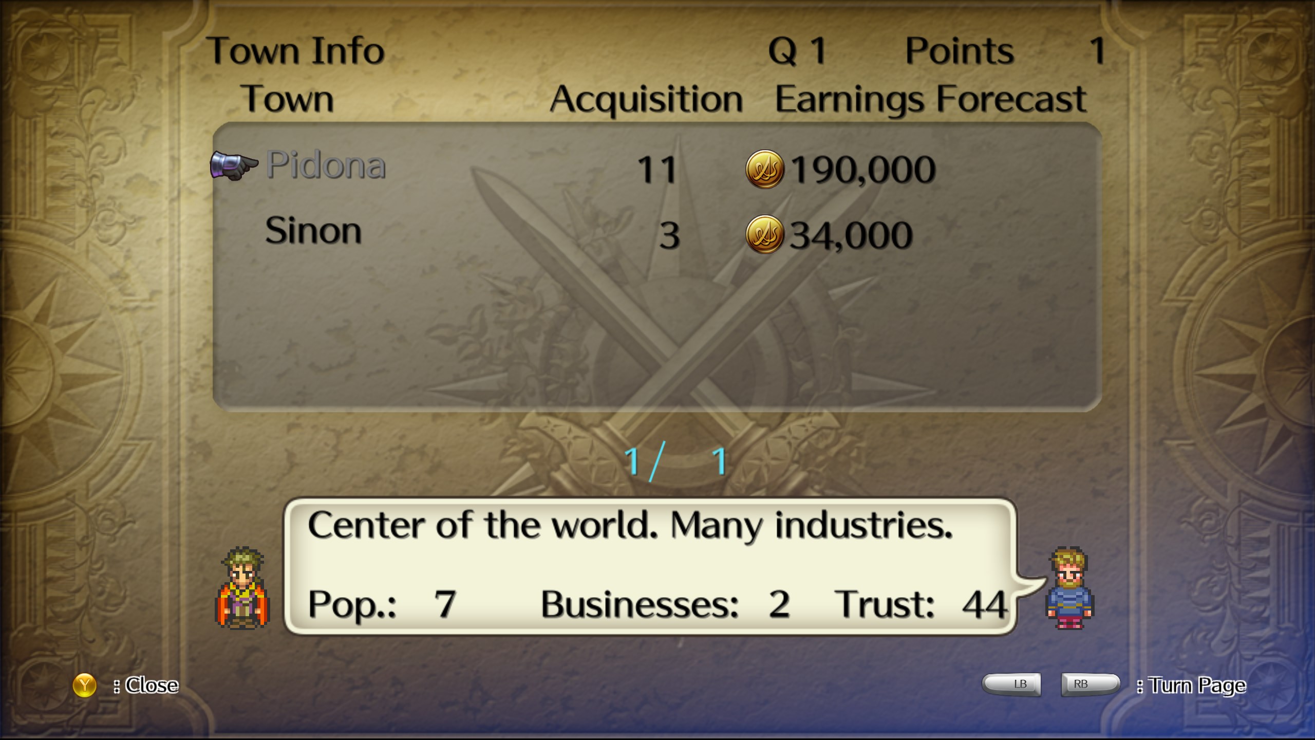 Well now I know to be more careful about that one monster sprite. But two hours in I find out I actually chose the character who’s just a business sim. I need to travel the world and create partnerships with various companies before an evil company buys them first and grows its empire. Manage income and expenses, business assets and skills, and more. So now I need to accrue a 100 million aurum (dollars).