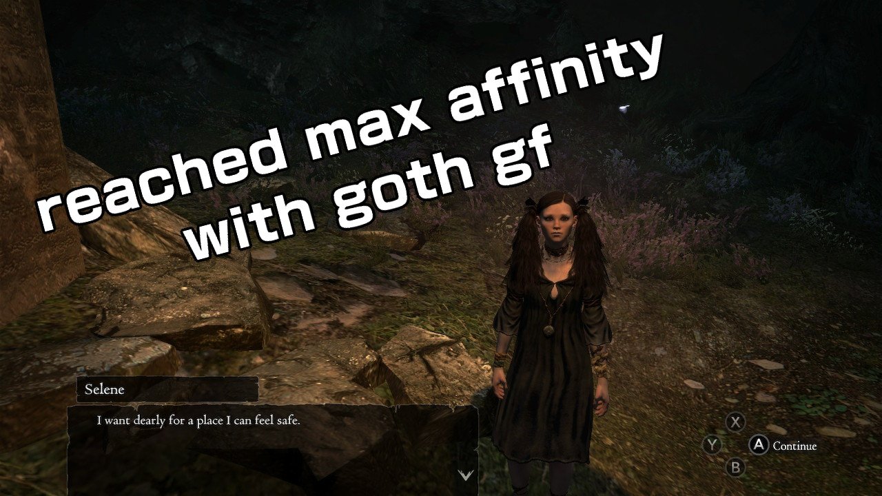 also accidentally reached max affinity with the very hot goth witch and she lives in my house now. narika and lyssi are down with being in a poly relationship though, so it’s cool.