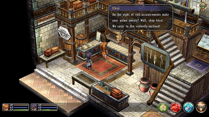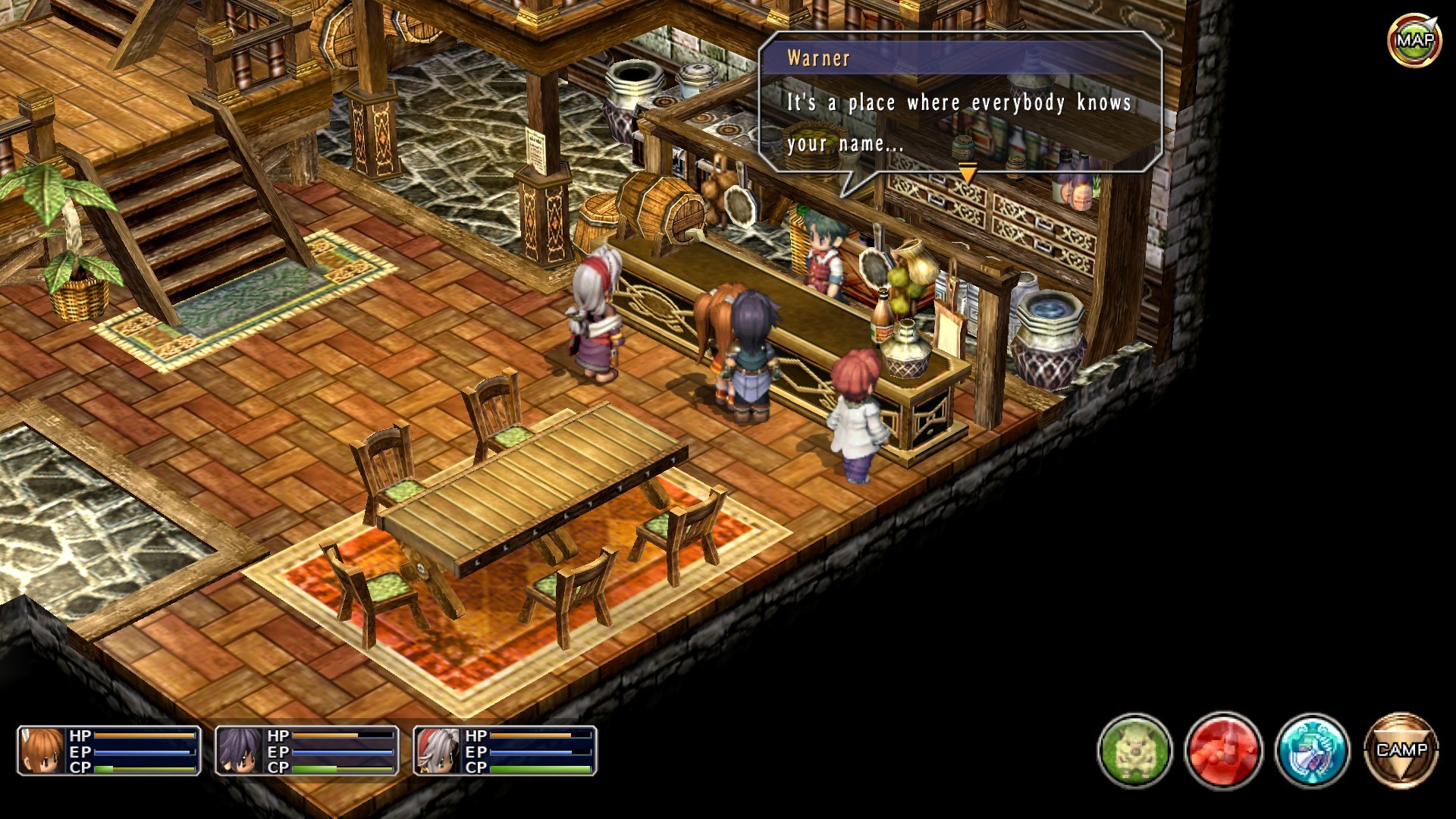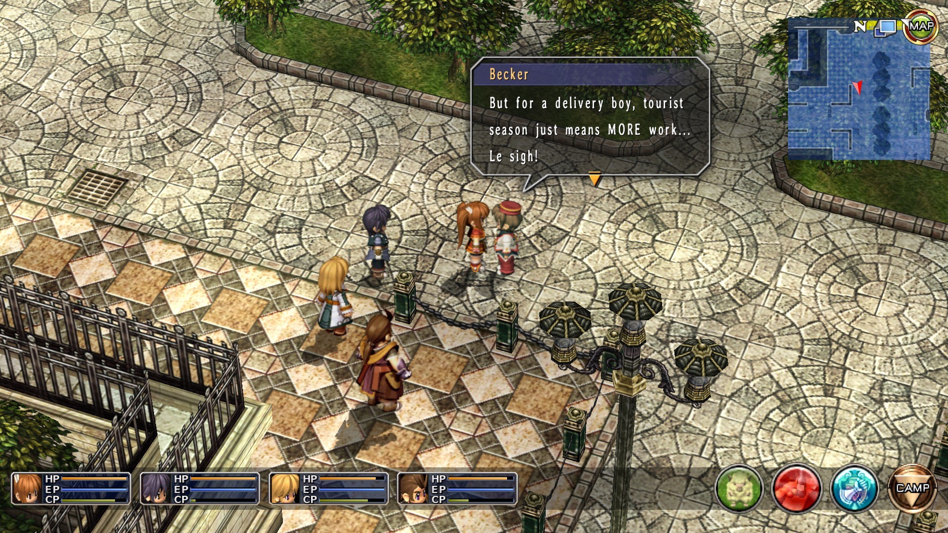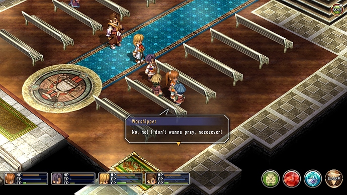 Yeah, those are both accurate sentiments I’d say. A lot of people say the games start slow but, really, I feel like that’s just the games’ pace all the way through. You leisurely solve a small problem in one town, a problem that requires much investment from the characters, and then walk to the next and do the same there. The personalities of the characters or locations never transcend the character archetypes they are immediately introduced as. There are a ton NPCs with individual names and small plot (and sometimes your characters even have back and forth conversations with them) but the writing is so bland and boring. I admire the amount of time Falcom spent writing for the game but barely any of it is interesting. It’s a typical JRPG through and through.