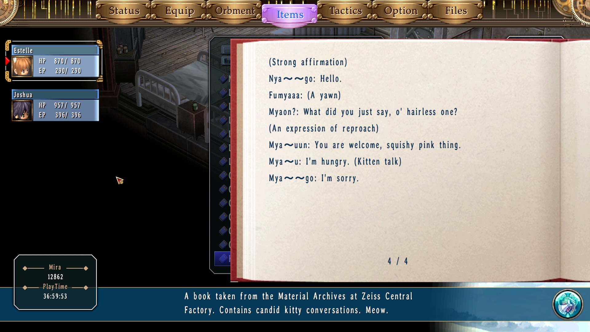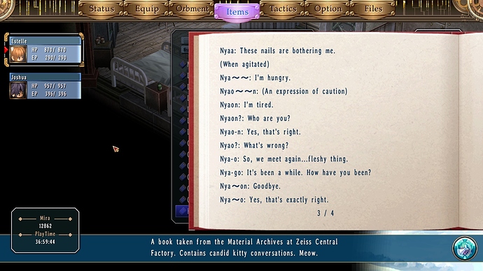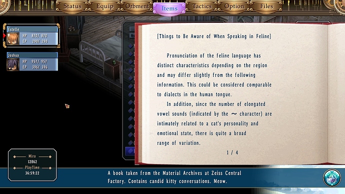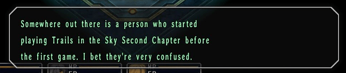 Oh for sure, I’m still sticking with it and I’m enjoying it simply for the fact that I haven’t played something like this in a long time. I had bought it way back when and now that Trails of Cold Steel 1 arrived on my doorstep I figured maybe I should get around to playing Sky past the tutorial. It’s just a really interesting pacing for a game. 10 hours in I’ve only walked around one village and some outlying fields, chilled around town, and did some menial labor. I literally have no idea what the game is about yet.