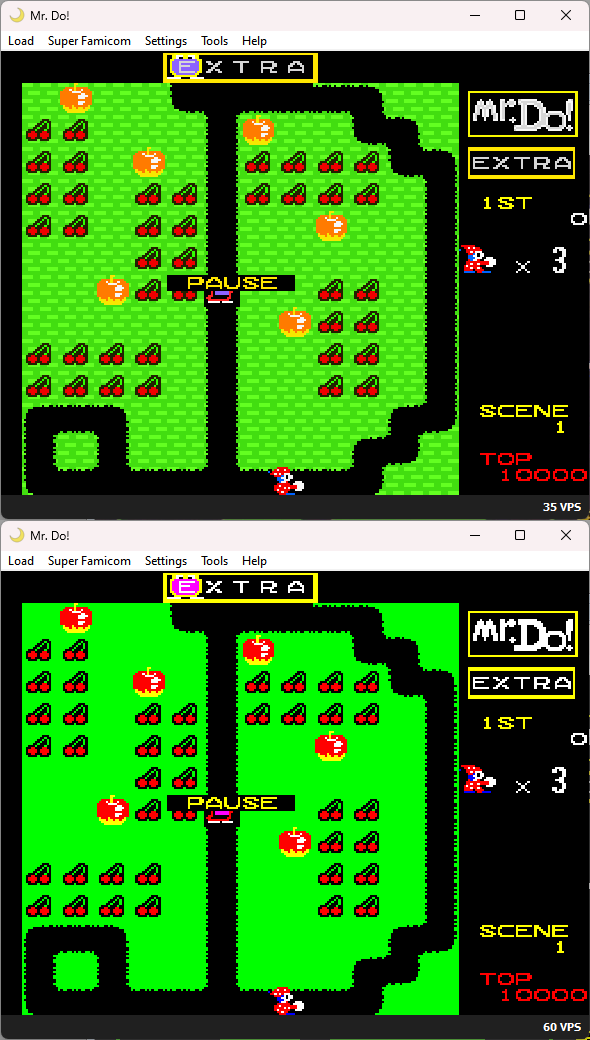 I think mostly I like it for the animation it adds to a game like Mr. Do!, where for chunks of time there could otherwise be large areas of the screen that are entirely static–but now they might have these really beautiful scan distortions crawling across them, little flares of static, and so forth.