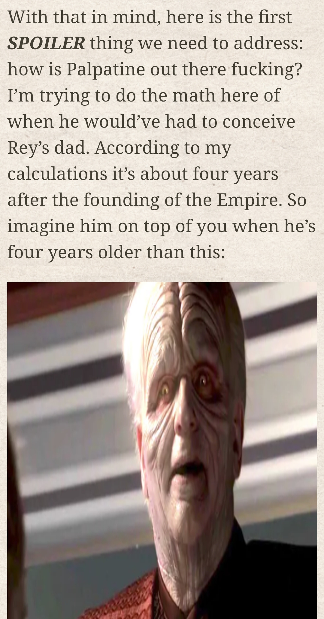 I think the only actively socially offensive (as opposed to artistically offensive) thing in the movie is the relentless and utterly shameless queerbaiting. Make the boys kiss JJ, don’t give Poe some old girlfriend to moon over to recalibrate the straightometer you fucking coward