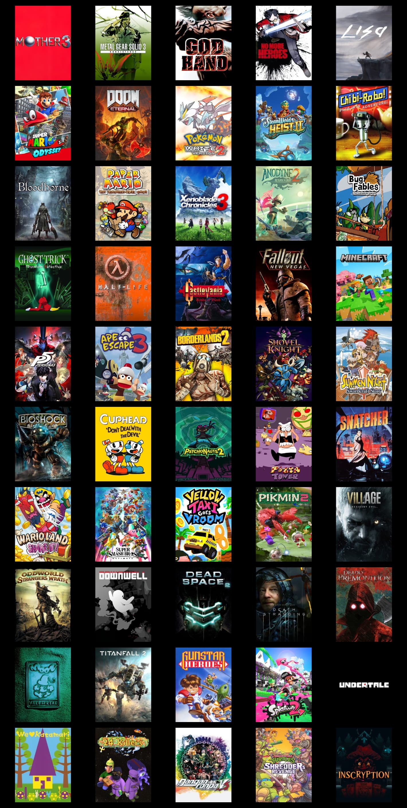 I’m extremely bored waiting for my next shift to start so I made a double sized grid. I limited myself to 1 per series (not one per franchise though hence multiple marios). I’d also like to add Deltarune probably should be on here, but I don’t wanna add it until it’s finished. Also also I think I might want to put Kingdoms of the Dump on here after I finish it cause I’m really REALLY liking it.