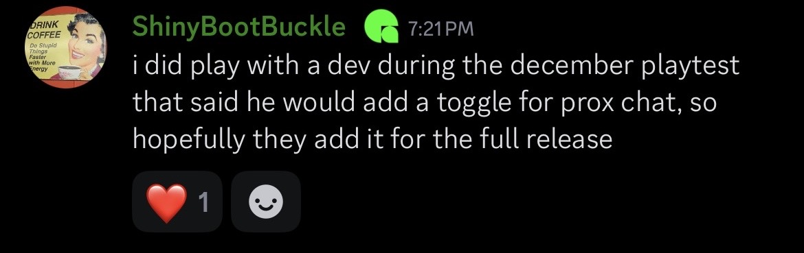 If I seem distracted, I’m out here politely tweeting devs and bumping feedback channels so I can toggle instead of holding down D-PAD RIGHT for prox chat.