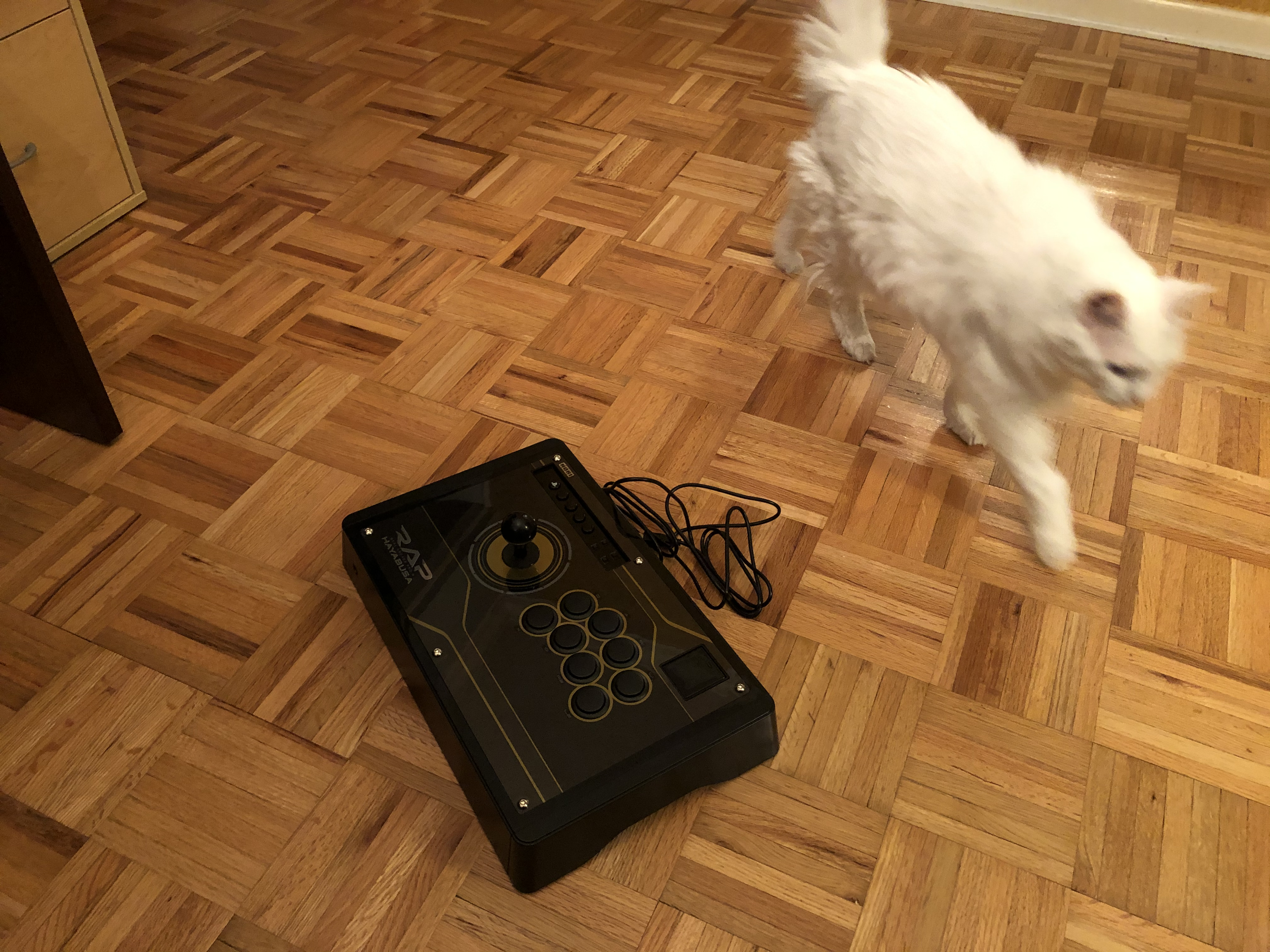 Other inputs: I acquired a Hori HRAP.N Hayabusa that reignited my love of arcade sticks. Very large cat for scale: