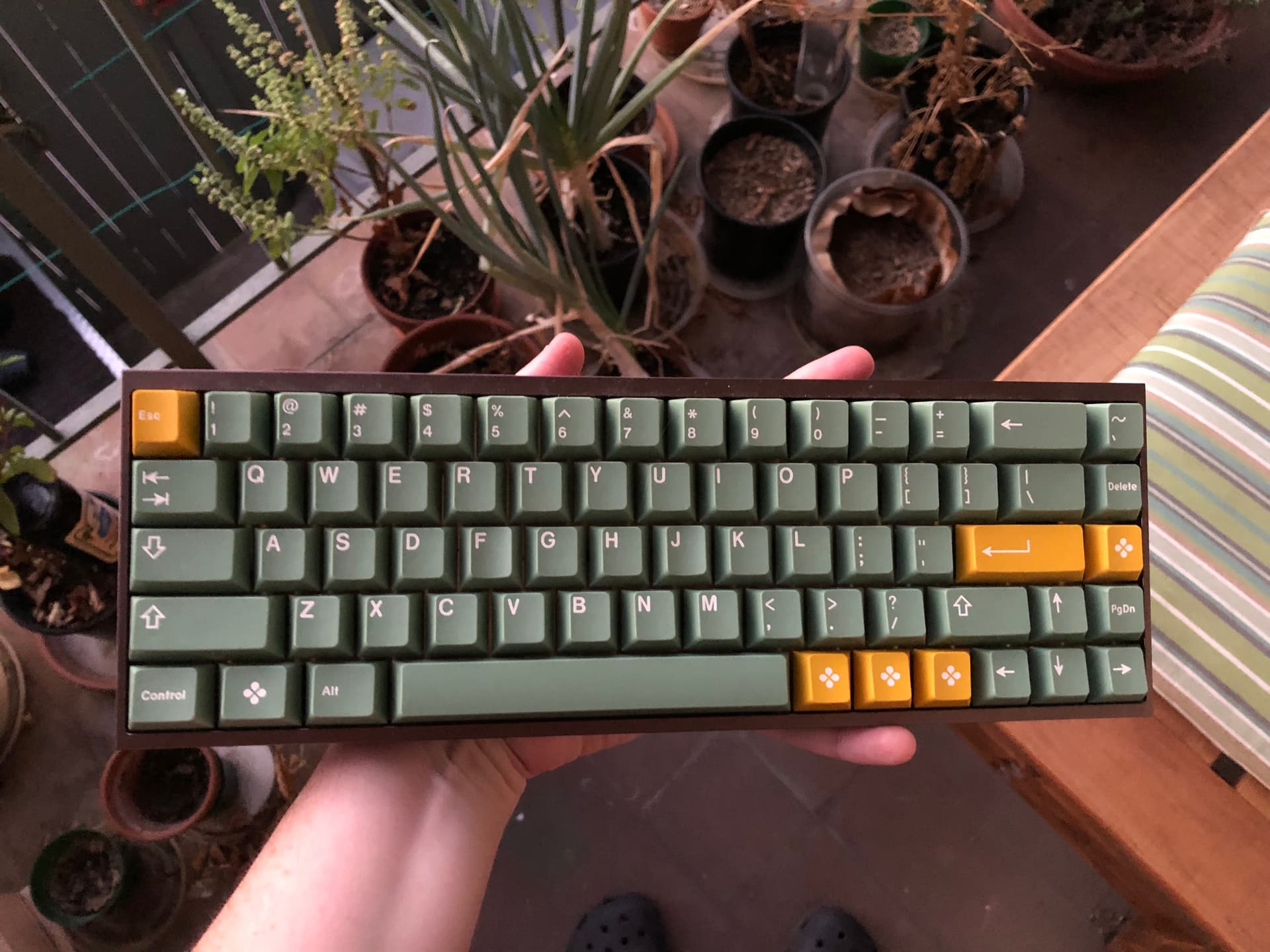 I am also waiting on a new tenkeyless wooden case and PCB I ordered in a group buy that I’m eventually gonna stick these keys onto. That’s why the layout is a little stupid and I’m using the yellow keys weird haha. End result will hopefully look… verdant! Fresh!! Something like that.