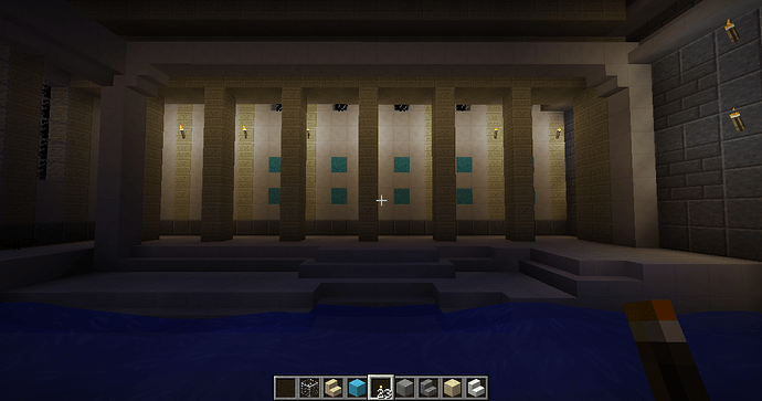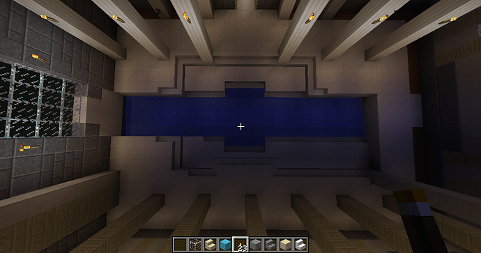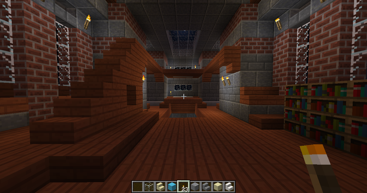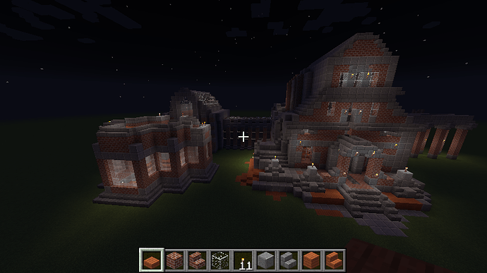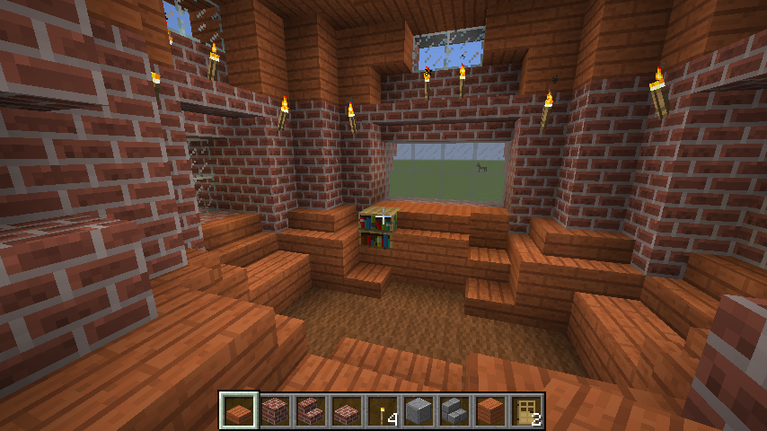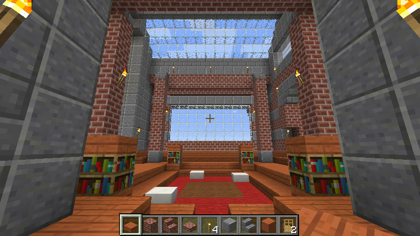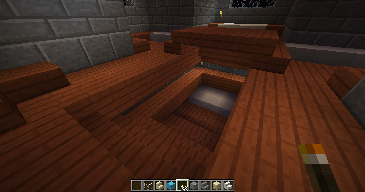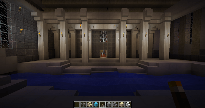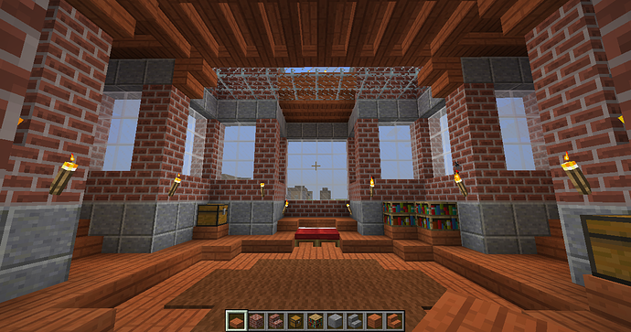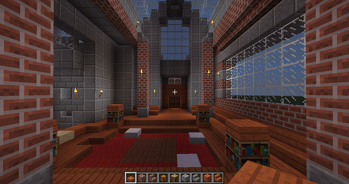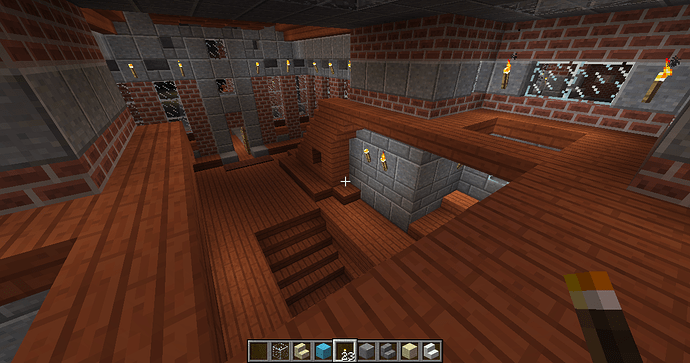 and some angles of some parts of the interiors. The building has four levels right now, with a basement story being the lowest one. Right now the highest level (the last screenshot) can only be gotten by an exterior staircase that leads to a low-ceiling second story and another staircase within that. When you enter from the front door there is a large primary chamber with a depression near the center that leads to a wood-and-stone basement complex. The next portion that I’ll be building will connect to a hall (see the second photo of the four above).