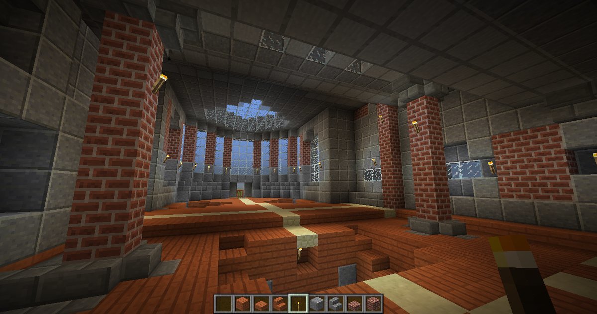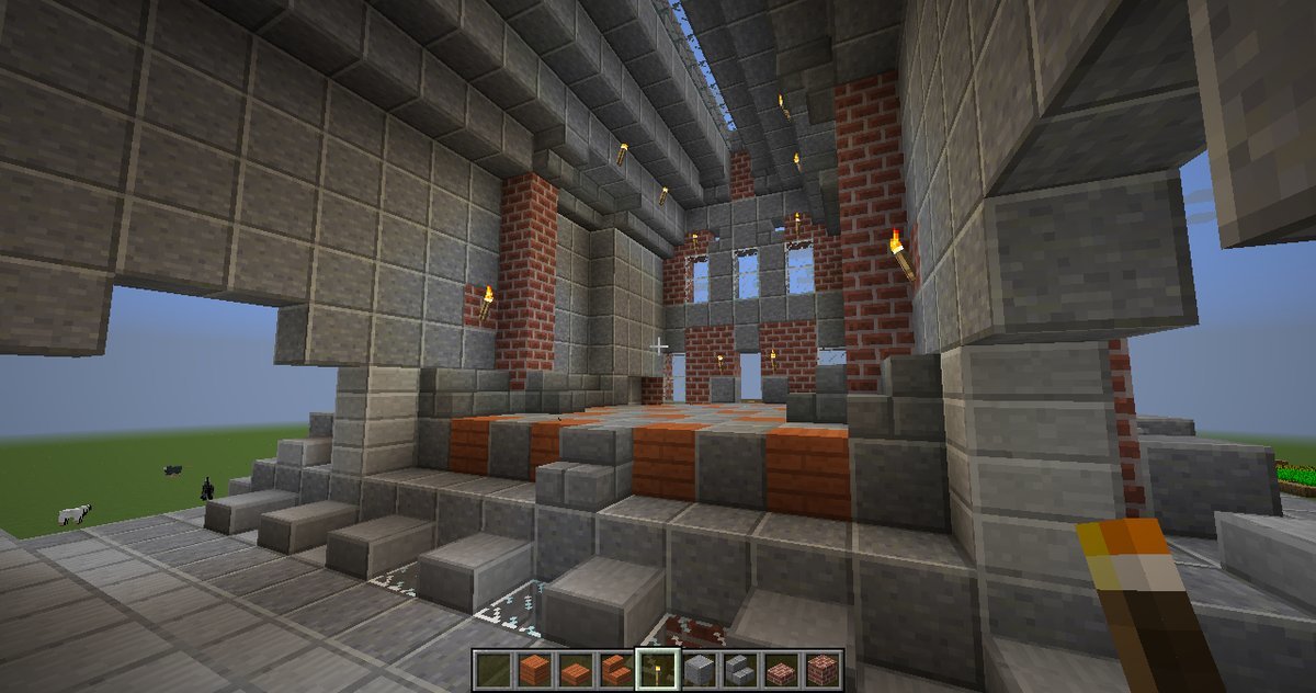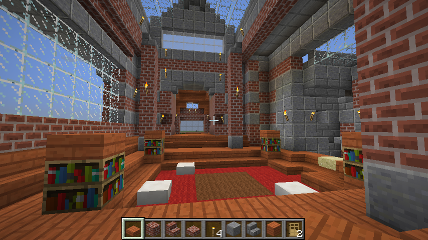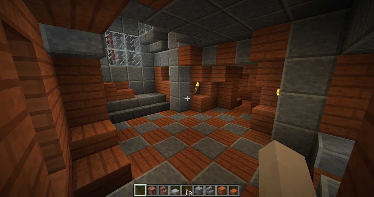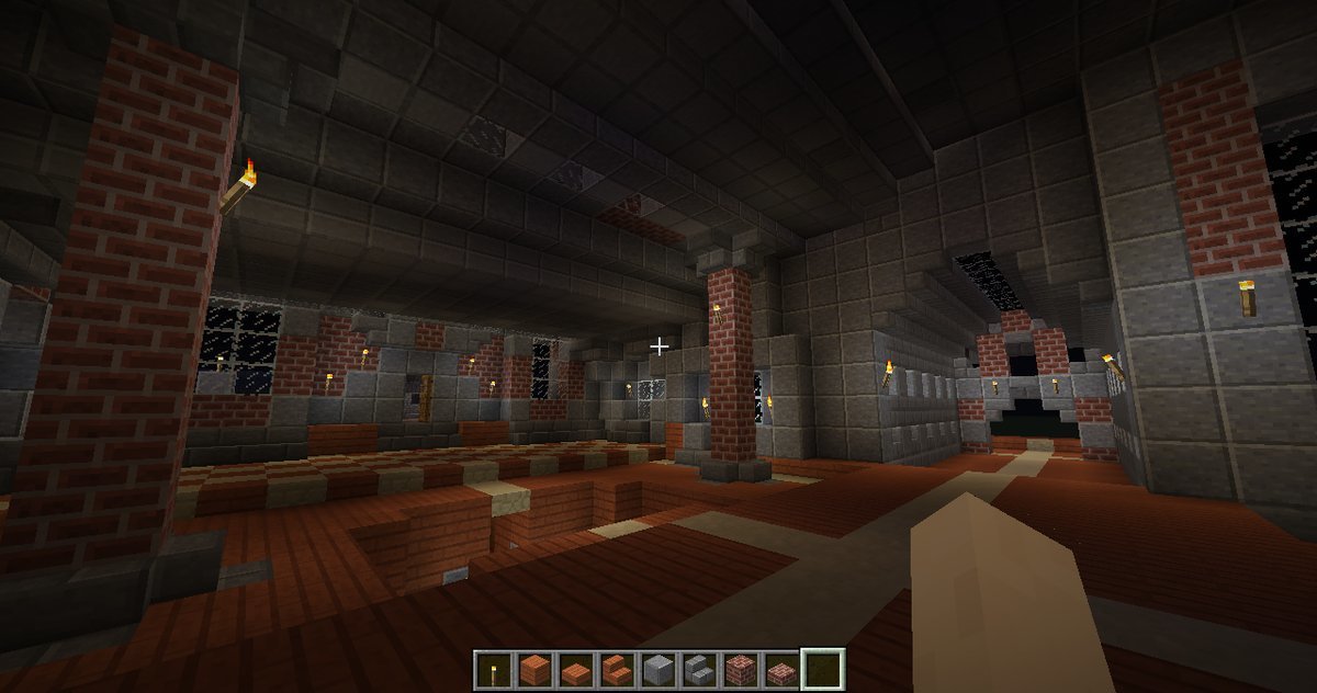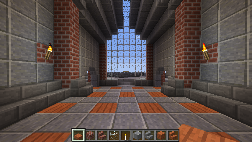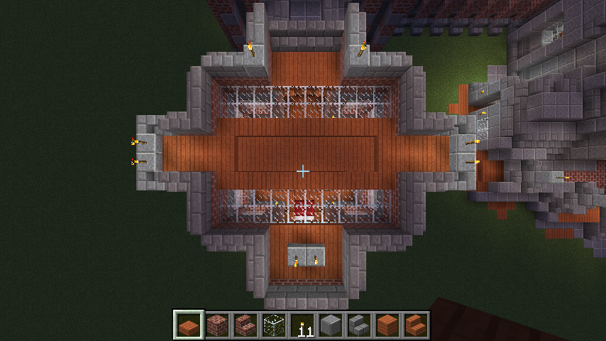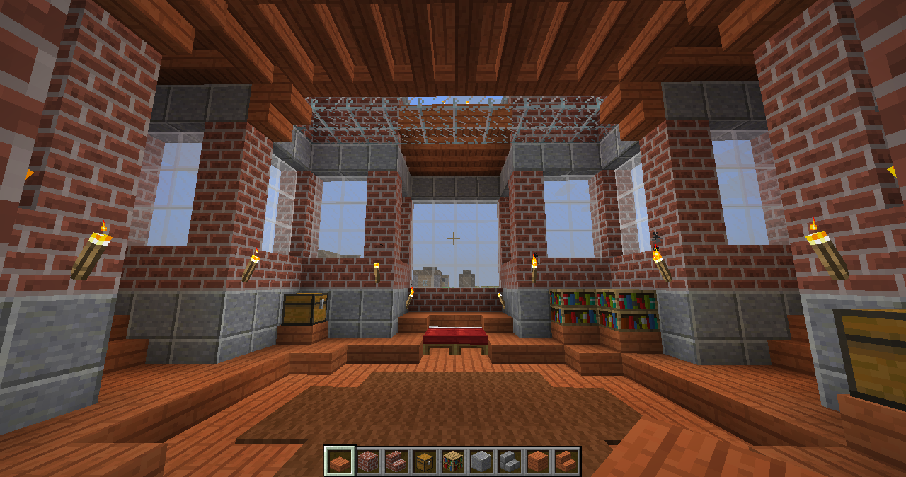 and some angles of some parts of the interiors. The building has four levels right now, with a basement story being the lowest one. Right now the highest level (the last screenshot) can only be gotten by an exterior staircase that leads to a low-ceiling second story and another staircase within that. When you enter from the front door there is a large primary chamber with a depression near the center that leads to a wood-and-stone basement complex. The next portion that I’ll be building will connect to a hall (see the second photo of the four above).