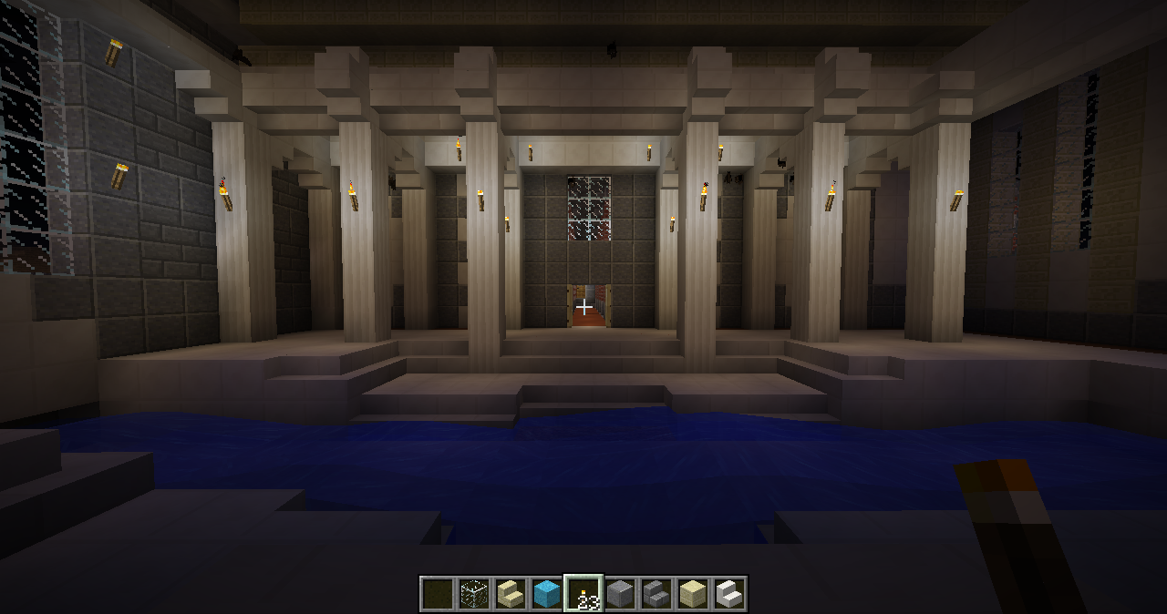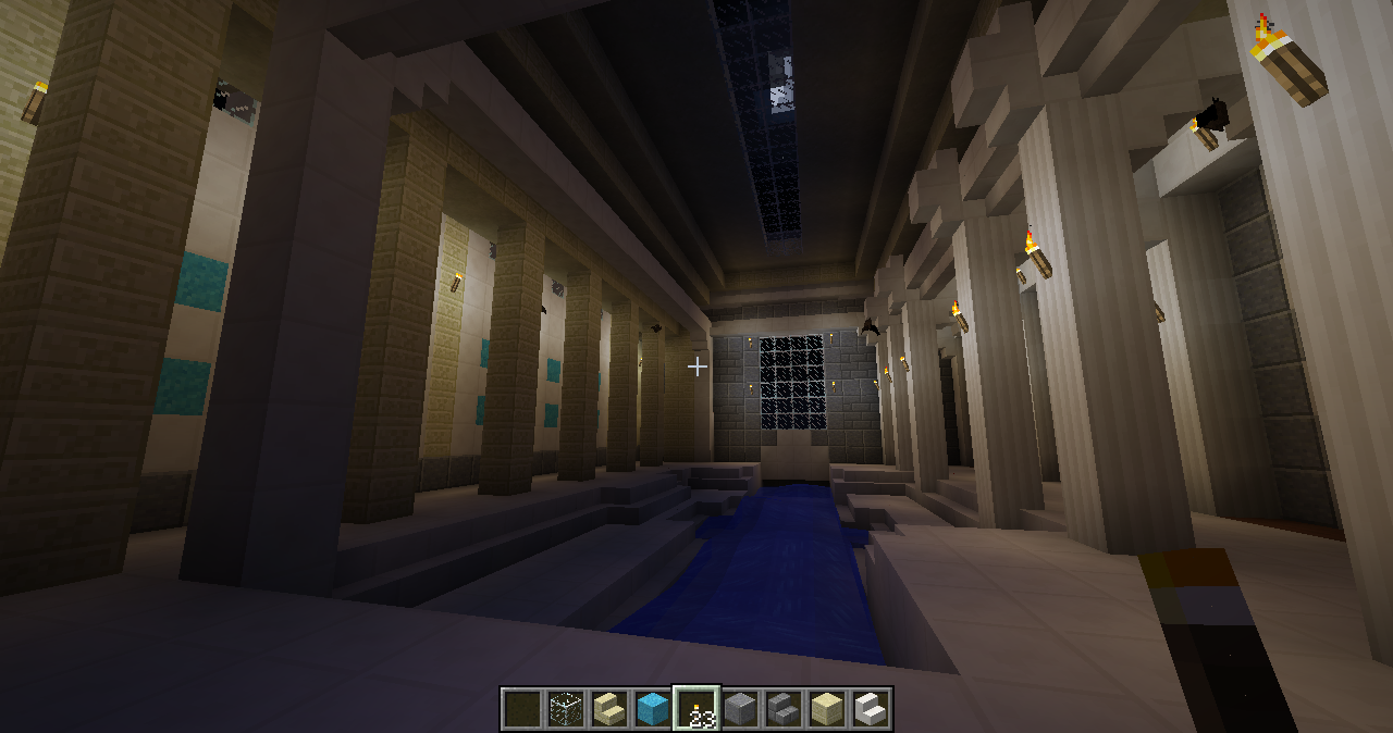 I added the bath house. It’s the large block on the right. I wanted to give it a dim, warm, insulated atmosphere, something vaguely Egyptian and Greco-Roman, so I strictly limited the fenestration and introduced a palette that’s unique to the interior. Some bats came in while I was still putting up the walls and roof and now they’re permanent residents. Maybe. I left the door open in case they would like to leave.