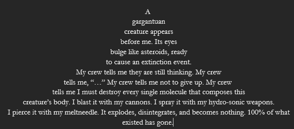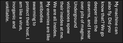 The ceiling shakes and rocks dislodge from their shelves. My machine is designed for this environment. With my machine, I am an apex predator. My treads crush rocks into powder as I rumble along. I keep my drill on always. I could turn it off. I will never turn it off. Walls are as soft as sand on the beach. Sometimes the pressure is so high that the hull gets squeezed. Squeeze too much, and the hull will break.