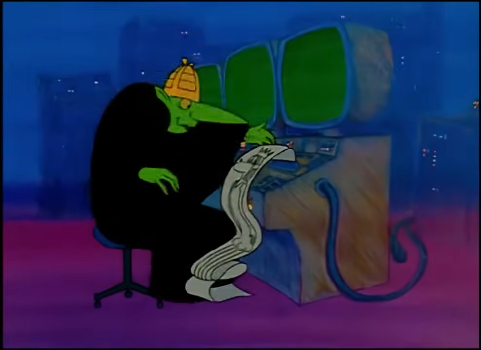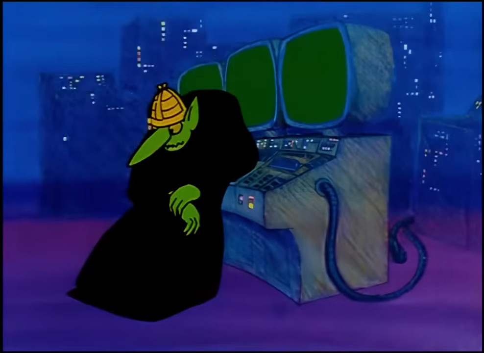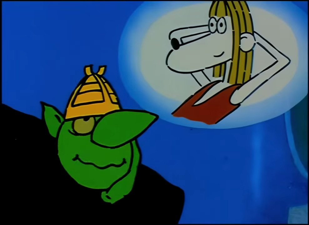 I watched Muzzy in Gondoland on youtube. This is one of those things you never hear about because it’s intended for kids learning English as a second language. It fuckin rules though. I checked it out because I liked Princess Sylvia’s design, so it was funny to find that the entire plot is that the evil advisor goblin Corvax likes Sylvia, she hates him, and so he uses his computer and his 3D modeling skills to make a fake Sylvia but screws up and makes a million of them. Very understandable problem, even enviable. This movie is so up my alley in every particular, not least that the ESL component makes the characters speak and act in extremely simple and straightforward ways, which makes the instances of subtlety and oddness more rich. The animation is gorgeous and neverendingly cute. The music has many moments of beauty.