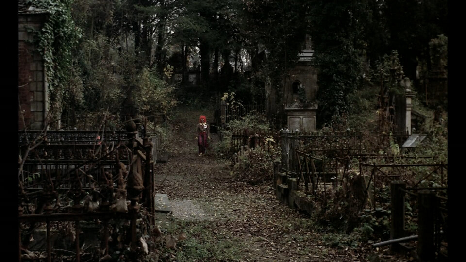 watched The Iron Rose, a jean rollin one about a couple getting locked in an enormous overgrown graveyard after dark. the graveyard is great! the film itself sorta starts dragging at the point where the two leads are just wandering around and fighting with each other and you think, ah, this is… the entire rest of the film i guess. but then at a certain point it’s like the script’s occasional rhetoric about the kingdom of death and the graveyard as a sculpture garden finally manages to overcome the vestiges of relationship drama and push things into a weirder and more energized direction. there is a wonderful eerie sequence where the lady character herself starts resembling a graveyard spook as you glimpse her climbing around behind the walls and poking her staring, grinning head through the crevices into the frame. and her sense of glee at roaming around the graveyard as visionary landscape is also what somehow lends weight to the veer into more traditional horror for the climax.