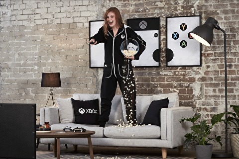 Pictured here is a grown woman in the Xbox Onesie, (deliberately?) spilling popcorn on her couch and pointing at the television in her apartmenttherapy.com living room.