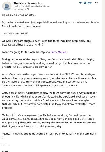 I hear Netease is moving dev to China to keep post-launch costs down. Fucked up. I donât really know what to tell students who wanna get into this industry any more.