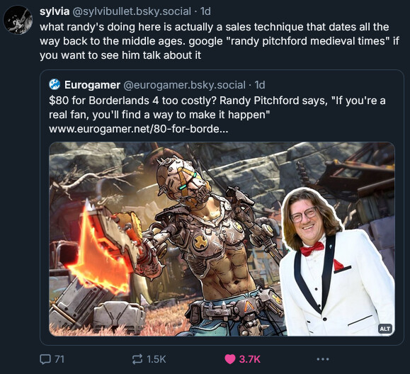 you can never be priced out of video games, you can only be priced out of very specific kinds of video games that represent a small and quickly contracting slice of the pie. no one will miss randy pitchford, and even the people who like borderlands won’t really miss it, there is nothing it does that isn’t everywhere now