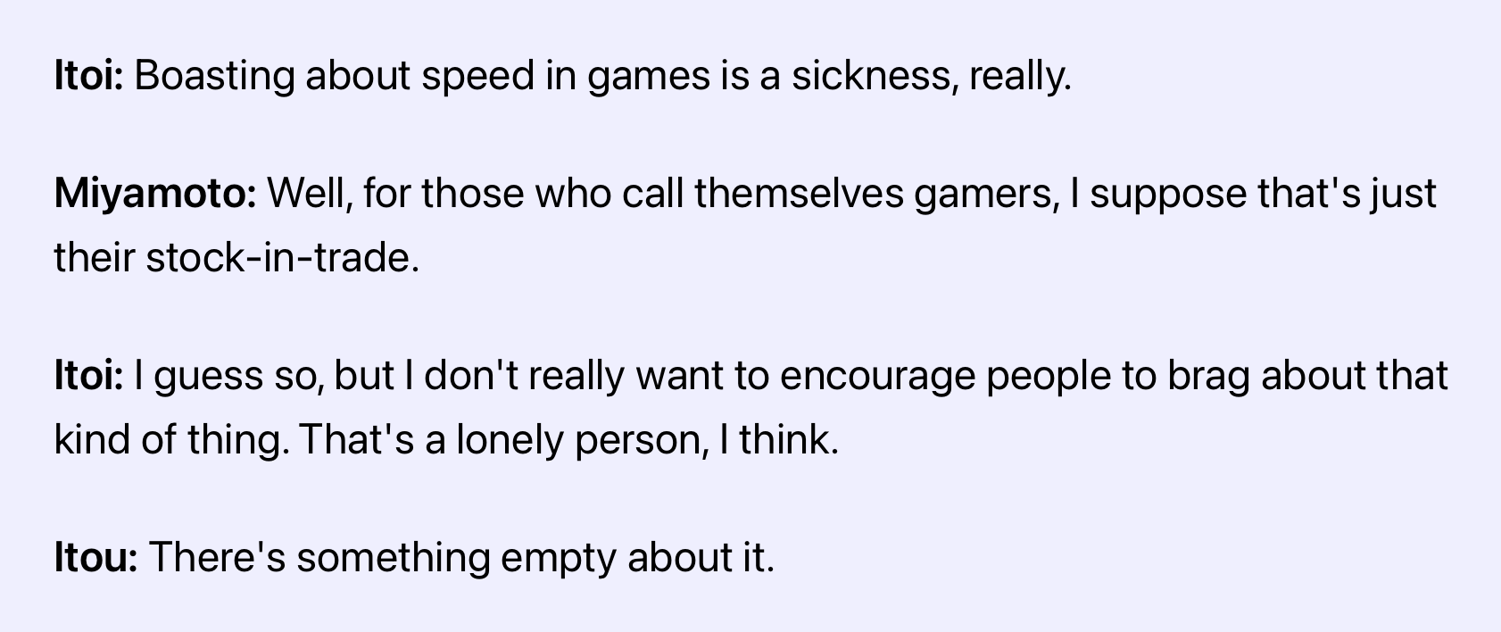i didn’t want to comment because i couldn’t tell if folks were doing a bit, but they’re not talking about “Speed” in the context of the actual games so much as the otaku culture around “i beat the game in three days!” etc.
