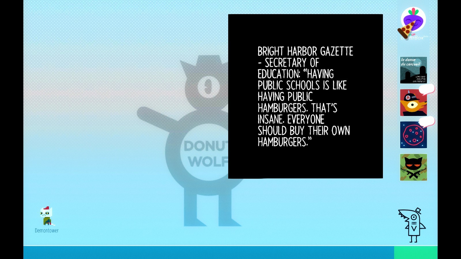 Demontower is super basic Hyper Light Drifter with a Souls skin and it’s cute but I don’t really enjoy it. Love the cute bosses though, and the title music. According to one of the community guides, it has a secret True Ending, which is a cute touch.