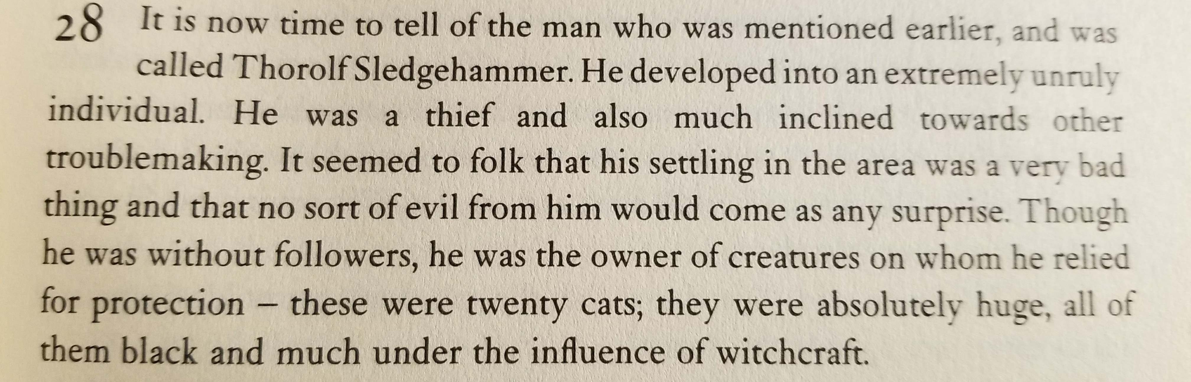 As things progress 18 men are unwilling to fight 20 witchcraft-enhanced cats and 1 man so they just set the house on fire to drive out the man.
