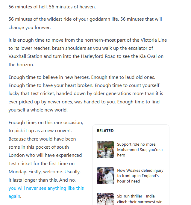 Simply watching one is never enough. We must obsess over it online, listen to all the podcasts, read all the pieces, snigger our way through TikToks, and yes, exult and outrage and hot-take all over everyone else’s feeds. A long Test series enforces an element that is the opposite of the binge-watch: the stinge-watch, when you hoard episodes and space them out for your viewing convenience. Barely a break to breathe between some Tests, but a week or more to meditate between others, and yet somehow the arrhythmia feels normal.