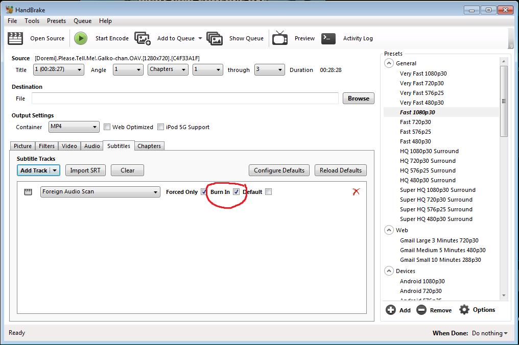 - If the video you want to share has softsubs, youâll have to burn those in ahead of time. Be lazy and grab Handbrake if you donât have it already, then look at this thing here: