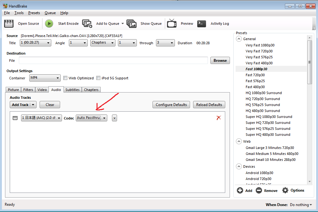 Also, donât let Handbrake muck with the sound, choose Auto Passthrough: