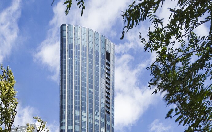 When completed, this 61-story tower, on an important site between Christian Science Plaza and the Prudential Center in Boston’s Back Bay, will be the city’s tallest residential building. A 211-room hotel will occupy the tower’s lower eighteen floors, with 188 luxury condominiums on thirty-six floors above.