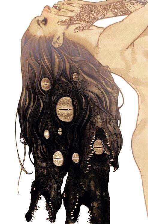 the last was a woman in a long black dress with a silver necklace and hair in long brown curls, headbanging violently to harsh ambient noise she was controlling on a glowing polychromatic sequencer, silhouetted against grainy black-and-white footage of running howling wolves that transitioned into u.s. drone strikes