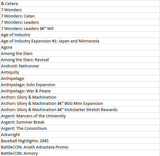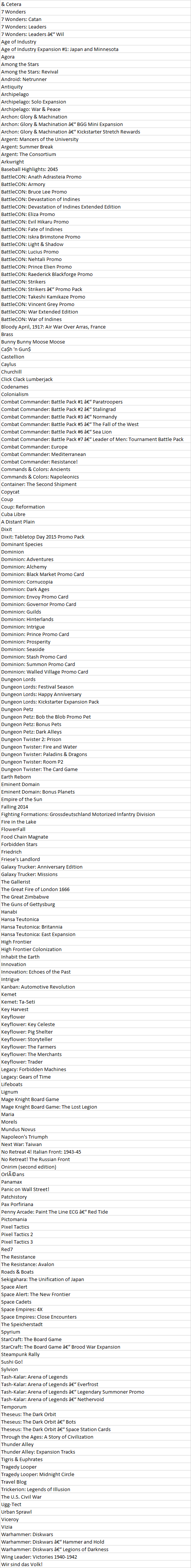 I couldnāt figure out if there was a way to filter out expansions/promos from the BGG export, but hereās my stuff: