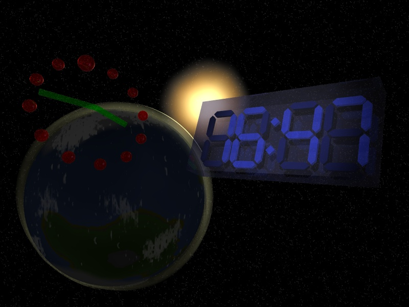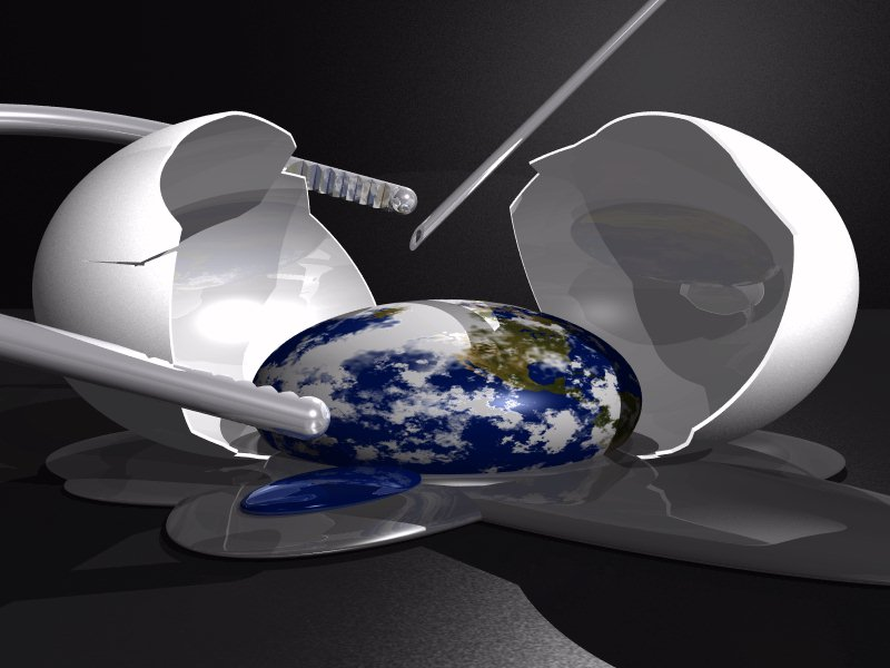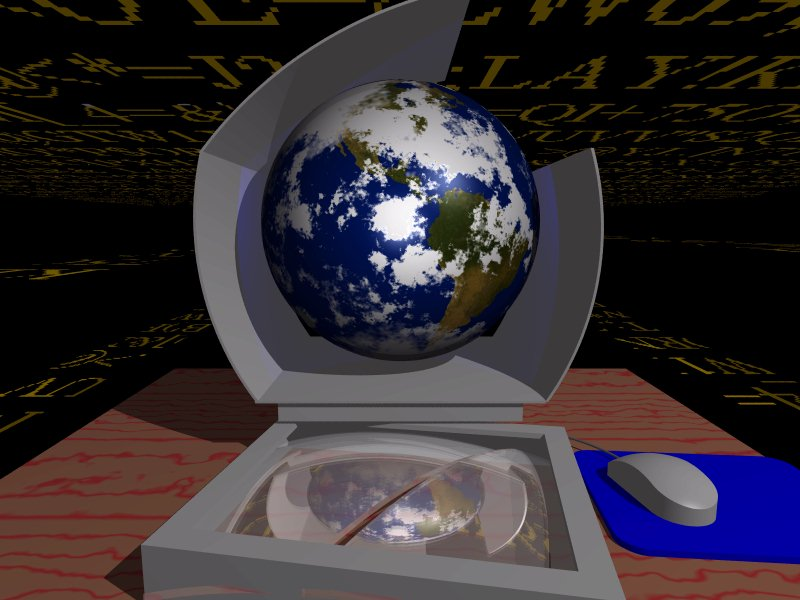 Rendering time: 7 hoursDescription: Most of the image was created manually with Pov-Ray, using primitive objects. Moray was used for image mapping the world and the text. The text was adjusted with Paint Shop. The world was found on Compuserve, flat as in medieval times. The uudecode was from Usenet, probably Cindy. I had scaling problems so the earth is too big, which deformed the monitor enclosure and broke the screen. I did not have time to fix it, but at least the earth is ok.