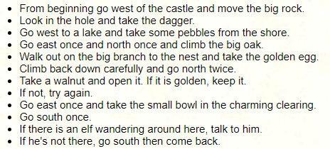 I know so little about IF history that I don’t really know where King’s Quest fits into it, or where it branched off from, but it is a well that I wish we’d gone back to a little more. Functionally it was first a world you had to explore, and map, at your own pace. After that you had to identify and solve the three big puzzles each of which had a violent solution that would fail 50% of the time, and a nonviolent solution that was worth more points. That aspect I know it shares with Zork. Also it had optional treasure. I’m always a big fan of optional treasure.