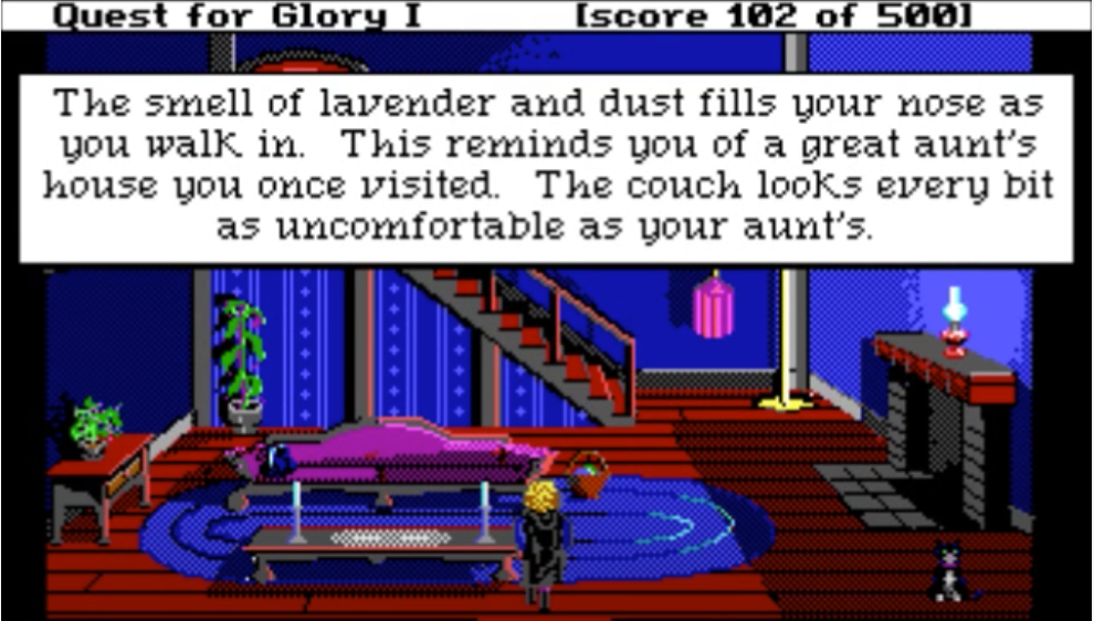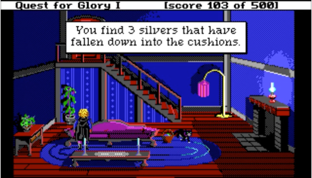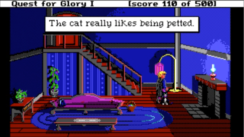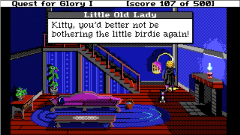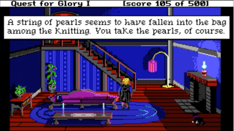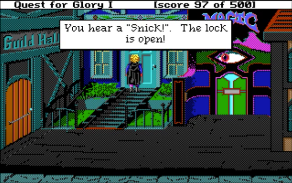 My favorite bit of QfG1 is robbing NPCs’ houses in town in the D&D Neutral Evil spirit. There are 2 doors leading at night into the houses of residents you can chat with during the day: a little old lady, and the town sheriff. It is only possible to enter these doors if you picked “Thief” class at the beginning of the game: the content is unavailable to Wizard and Fighter classes.
