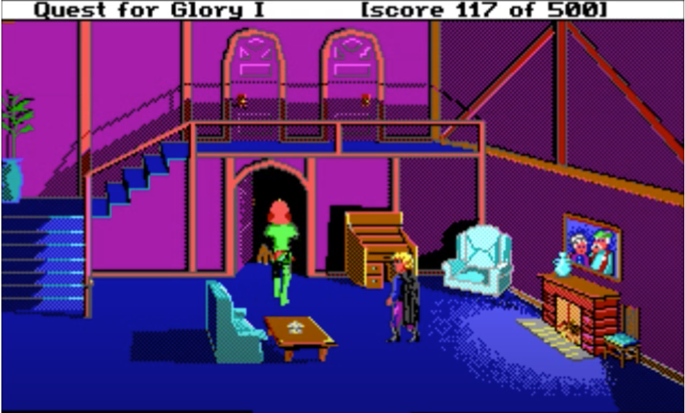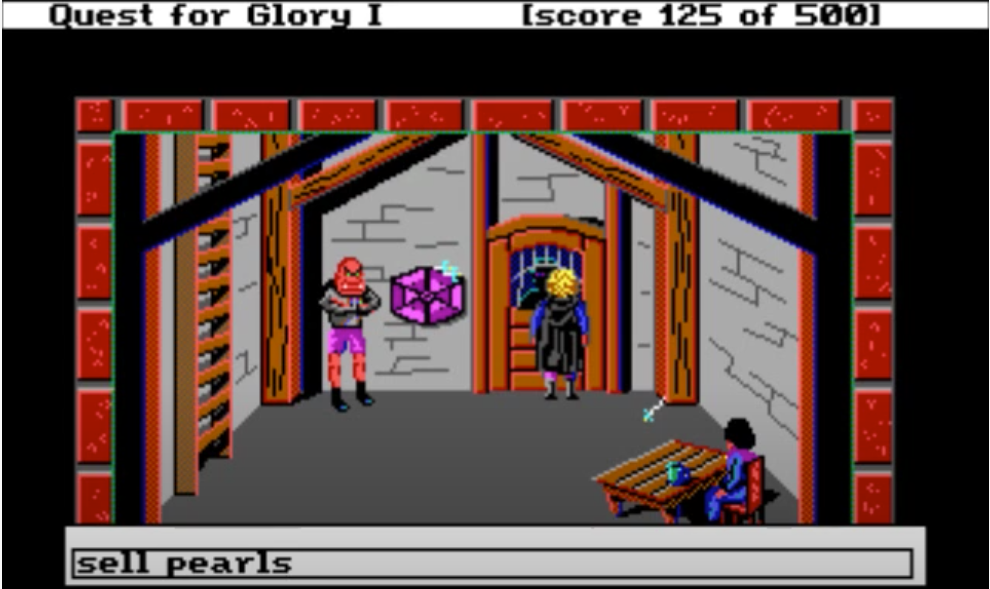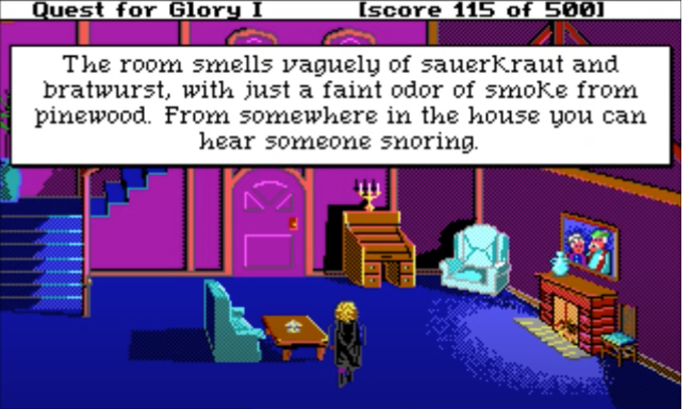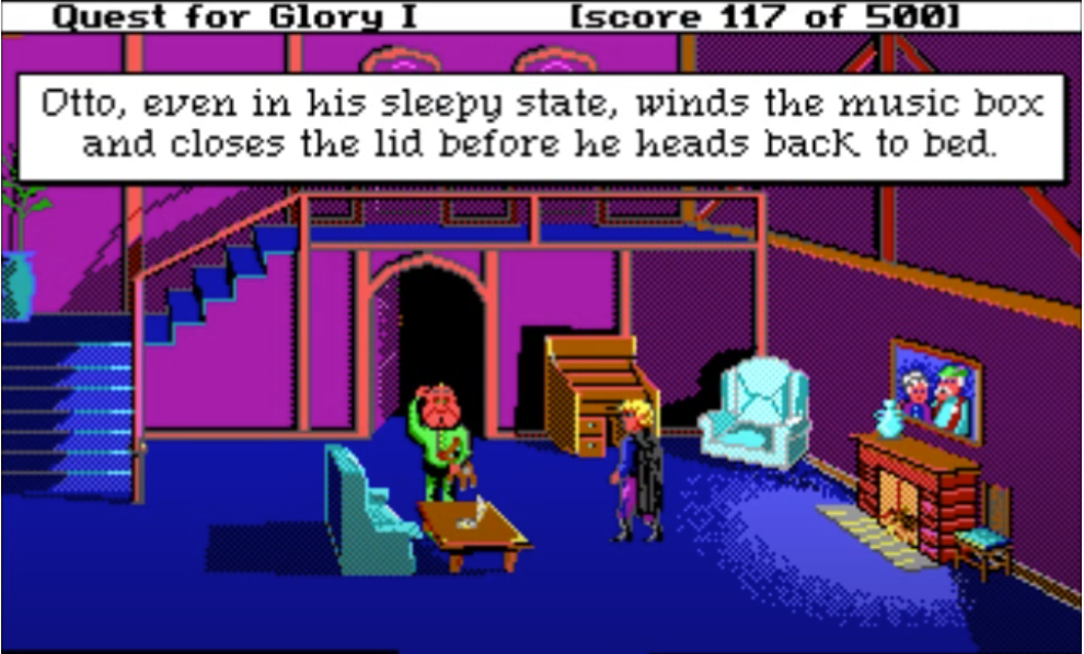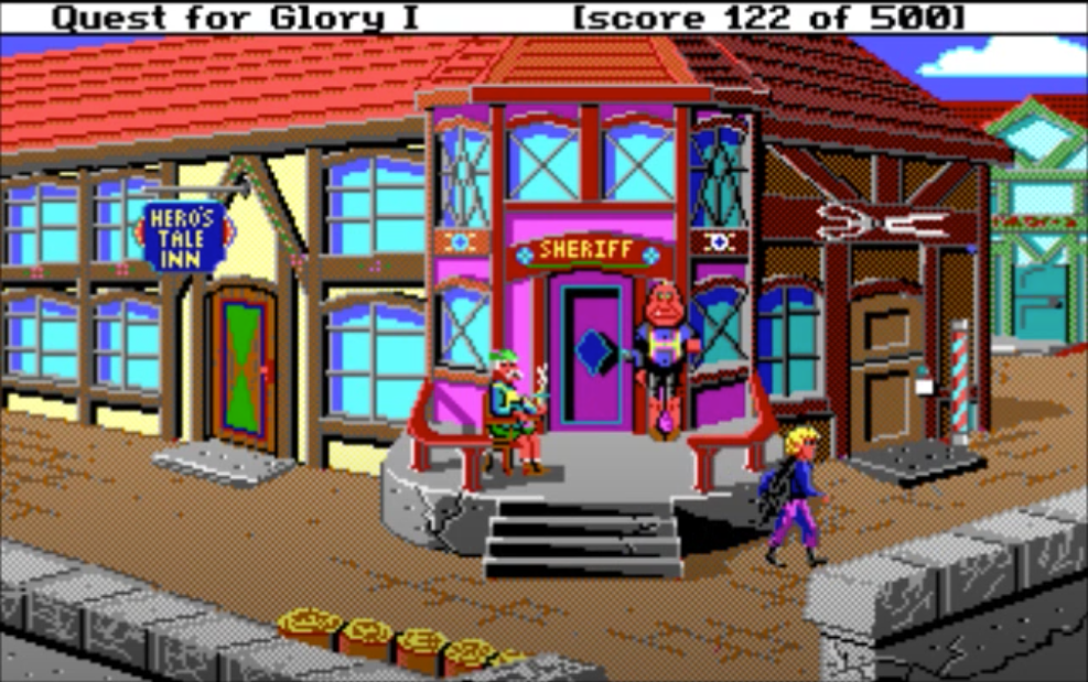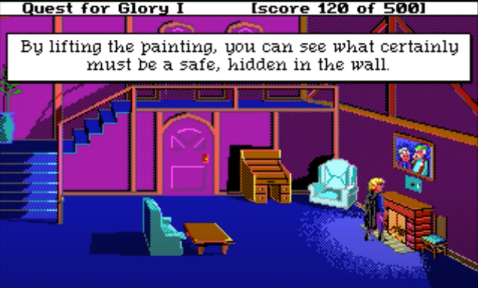 My favorite bit of QfG1 is robbing NPCs’ houses in town in the D&D Neutral Evil spirit. There are 2 doors leading at night into the houses of residents you can chat with during the day: a little old lady, and the town sheriff. It is only possible to enter these doors if you picked “Thief” class at the beginning of the game: the content is unavailable to Wizard and Fighter classes.