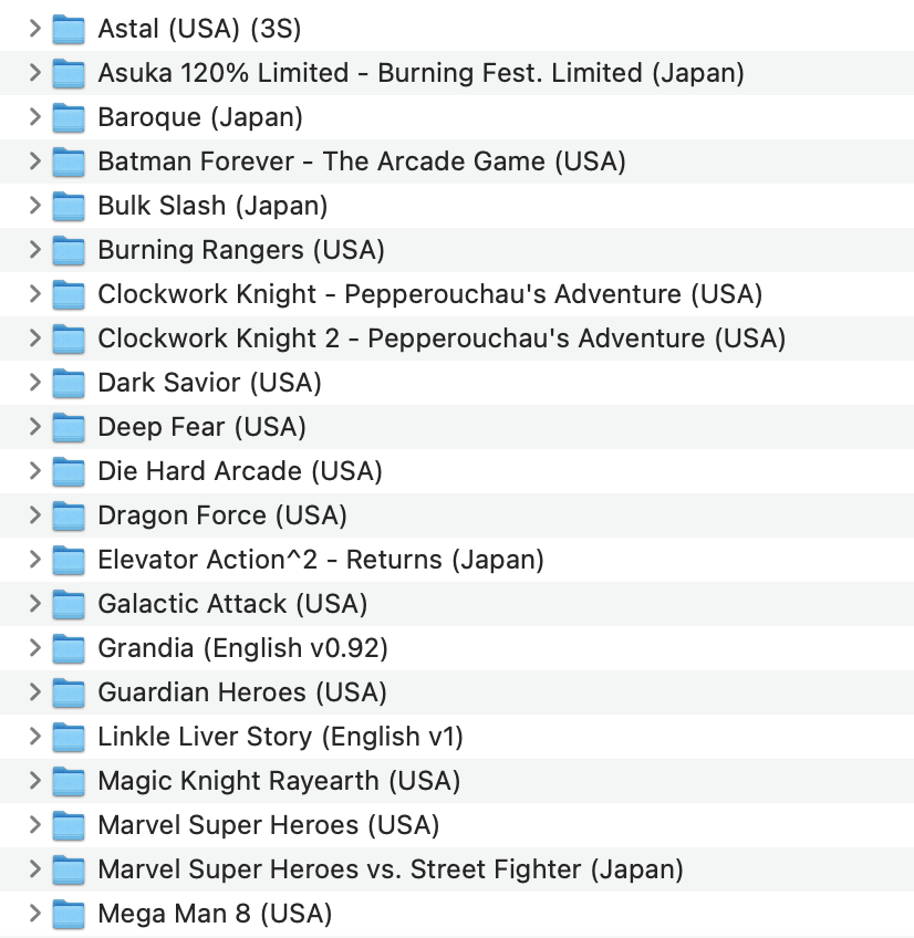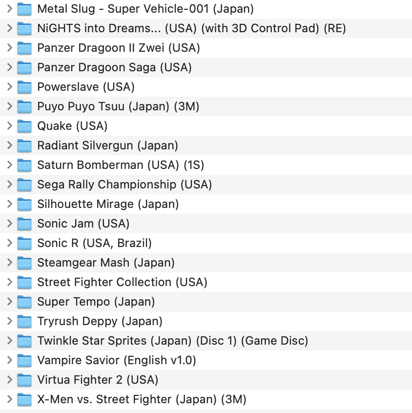 been loading up the SD card with Saturn games to play now that I have an ODE. I have never spent any real time with the system or its games. here is what I’ve got. still some space left: tell me what I’m missing, tell me what I did wrong, tell me what I need. I’ve skipped Virtua Cop because I don’t have a lightgun at the moment