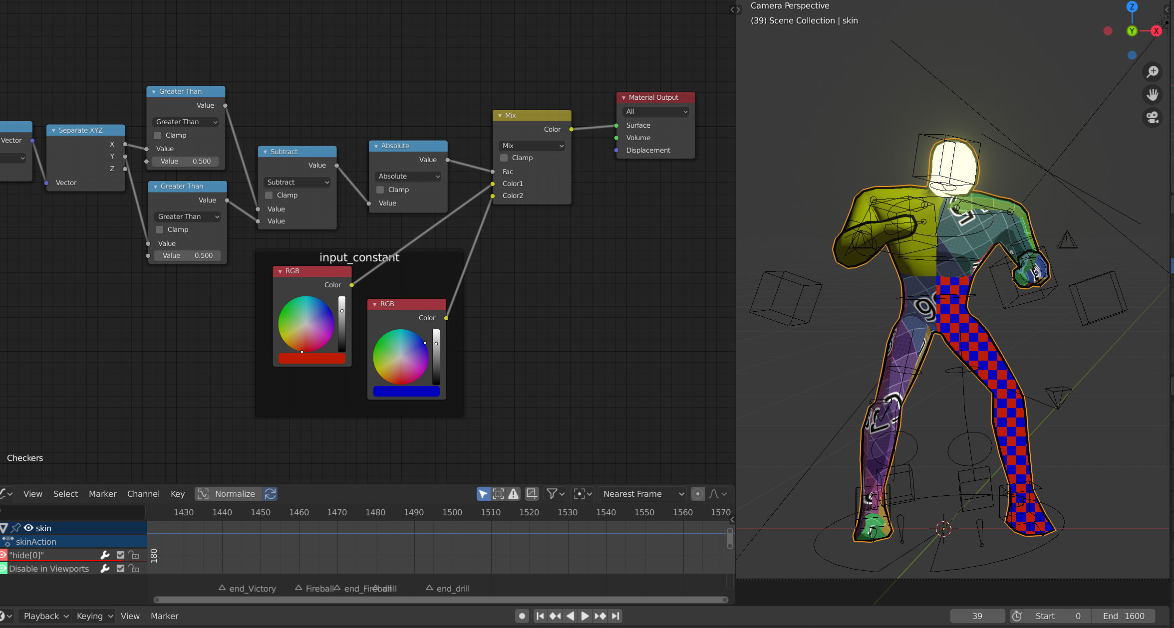 I’ve had a blender-shader-nodes-to-HLSL (the shader language used by DX11) conversion script lying around for quite a while, so I finally took some time to integrate it into my mesh exporter and overhaul the whole mesh conversion code to clean it up a bit. The result is I can pretty much design my materials and have them look the same in my engine, complete with being able to override the colors per player.