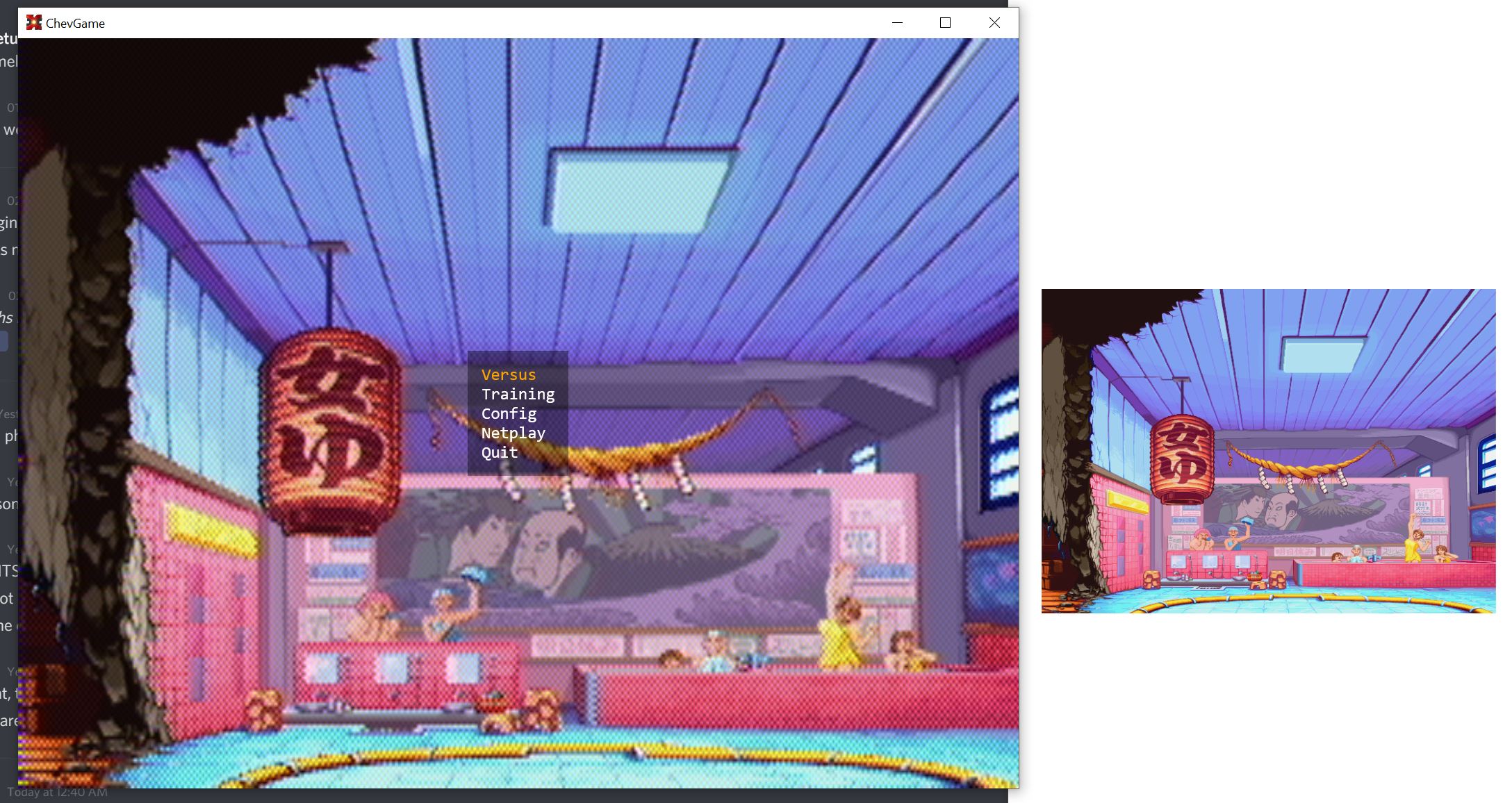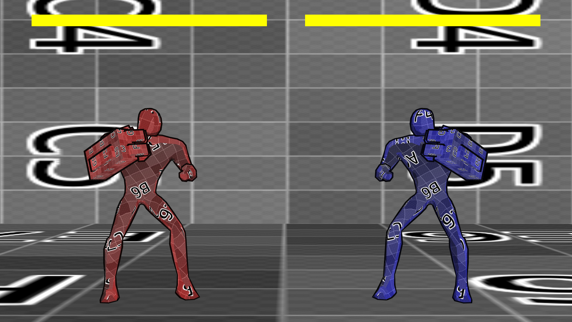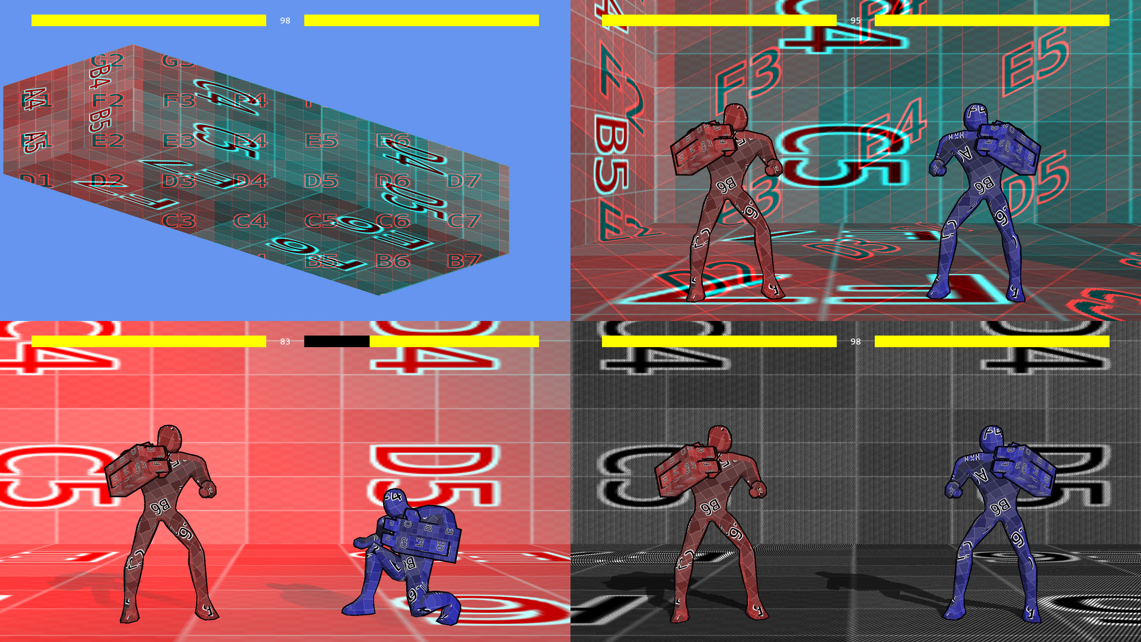 I’ve been working on some not too visually striking stuff although there’s now configurable upscaling/downscaling of the main picture (here it’s a 2x downscale combined with MSAA), but here’s a nice one. From basically the beginning I’ve been handling character directions by flipping only the pose, ie if you look at the magnificently textured bodies of the fighters you’ll see they present a different side to the viewer instead of sprite-style mirroring. If they had an eyepatch, it’d be behaving like Sagat’s in SF4 rather than Baiken’s in GG Revelator.