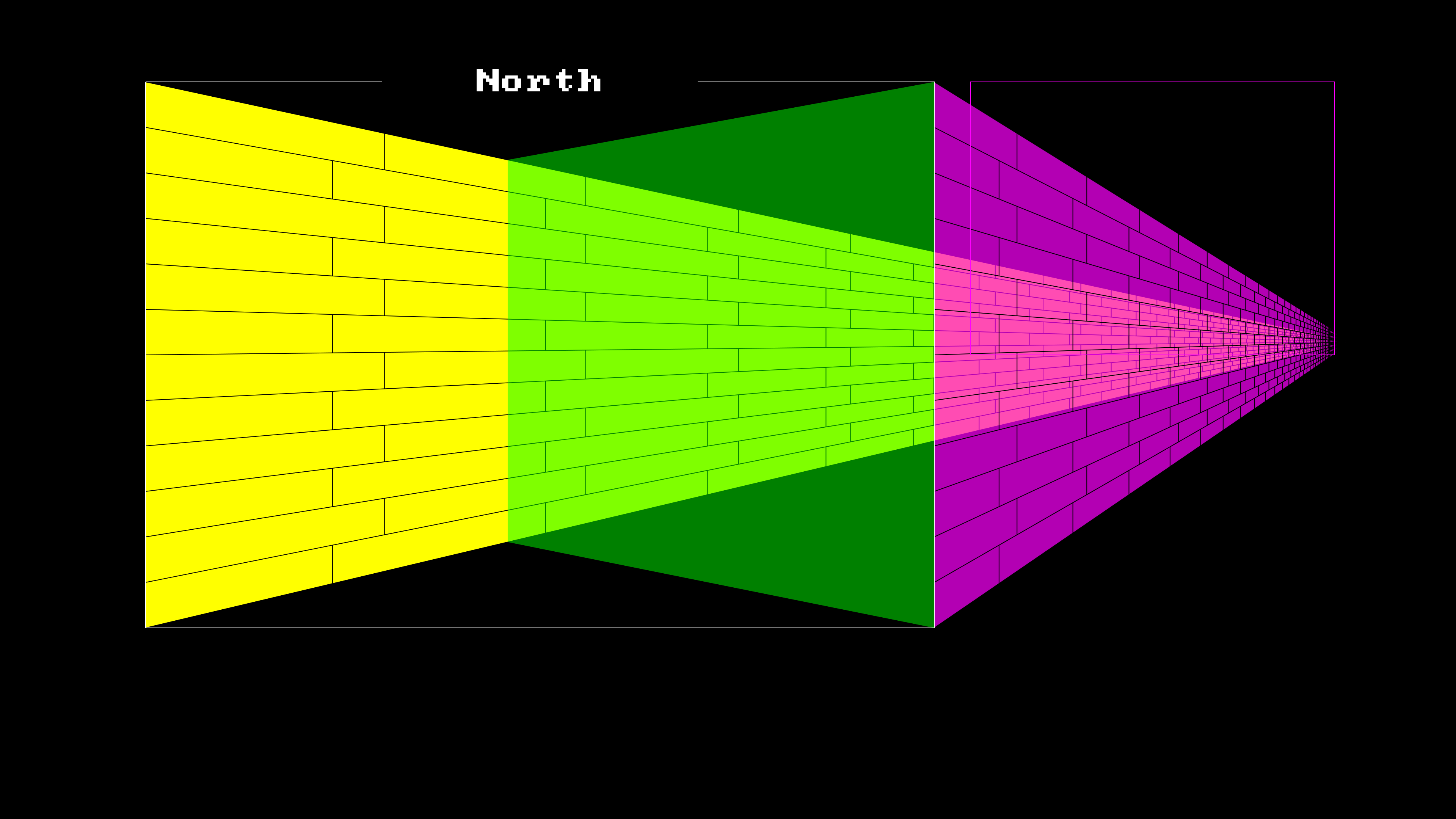 As a side note, of course in the traditional Wizardry-style model, it’s mechanically significant how far ahead you can see, so just showing all the paths ahead into the distance like this wouldn’t necessarily be desirable (like in the sense of the mechanics of MILWA and so on). I think it looks cool drawn like this with everything in view