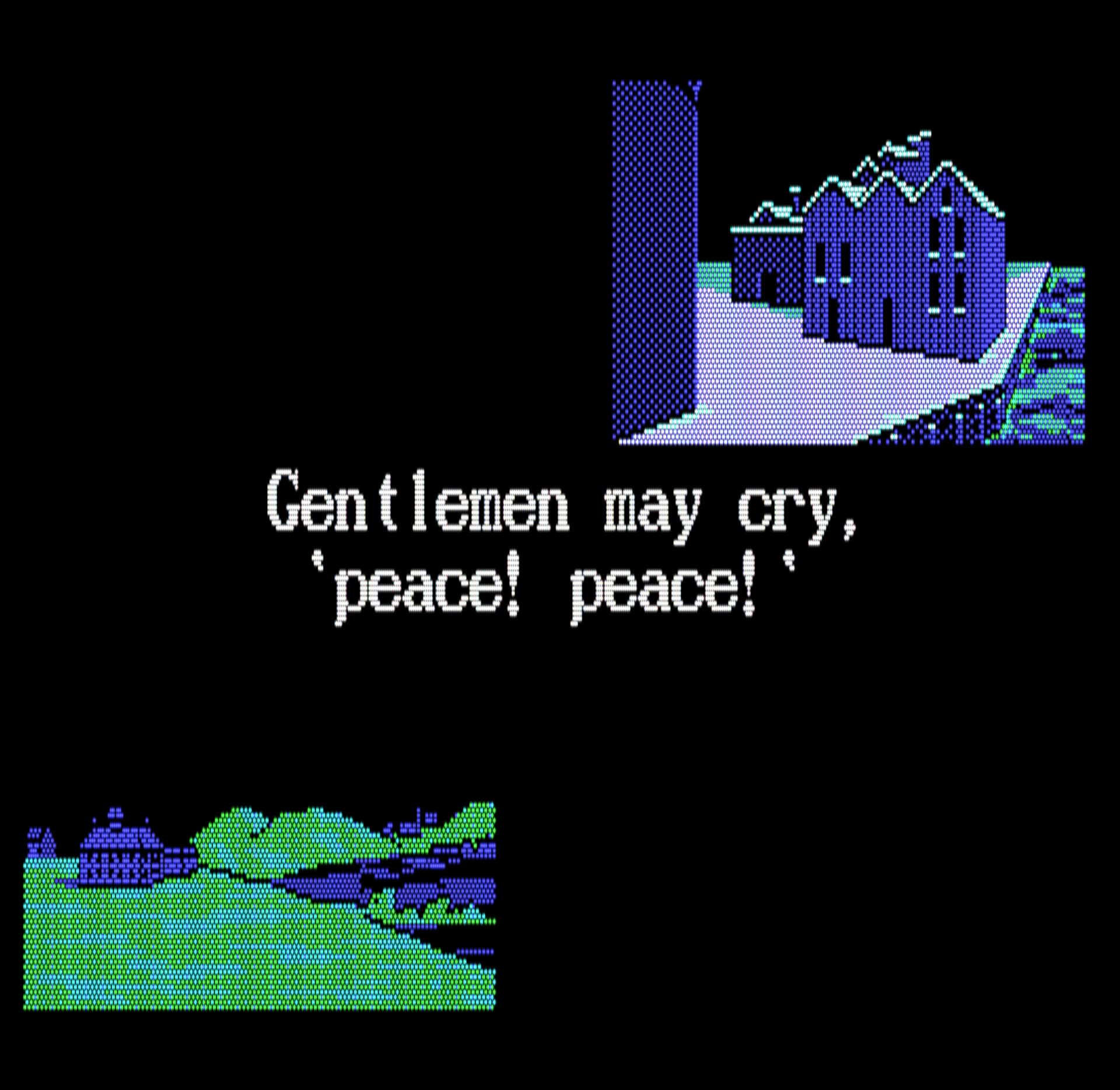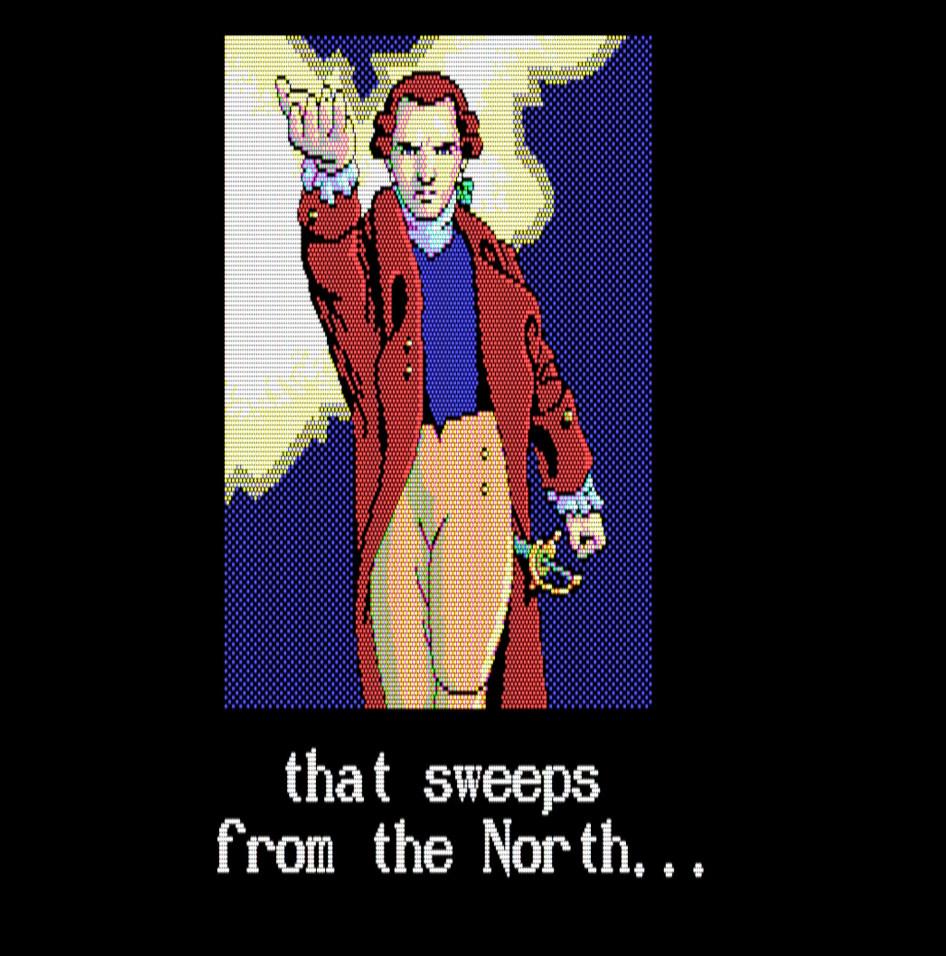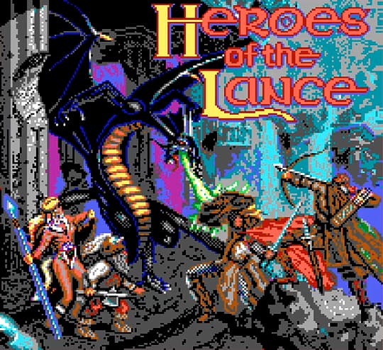 Story screen from FM-Towns version of Dragons of Flame (https://youtu.be/lpTk-N0-lTg?t=58), with characters and foreground from the Dungeons & Dragons module B8 “Journey to The Rock” cover by Larry Elmore: